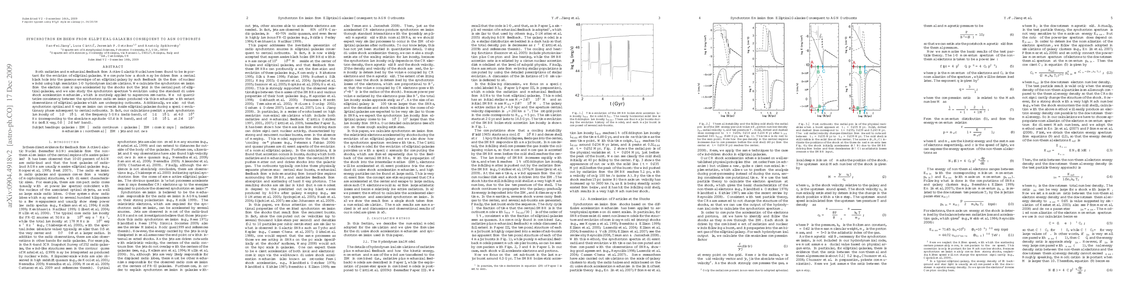 This research investigates synchrotron emission from elliptical galaxies following Active Galactic Nucleus (AGN) outbursts, using high-resolution simulations to model the shock-driven acceleration of cosmic rays. The study finds good quantitative agreement between predicted synchrotron radio, optical, and X-ray emissions and observational data, predicting significant luminosity in these bands during the post-outburst phase of elliptical galaxies.