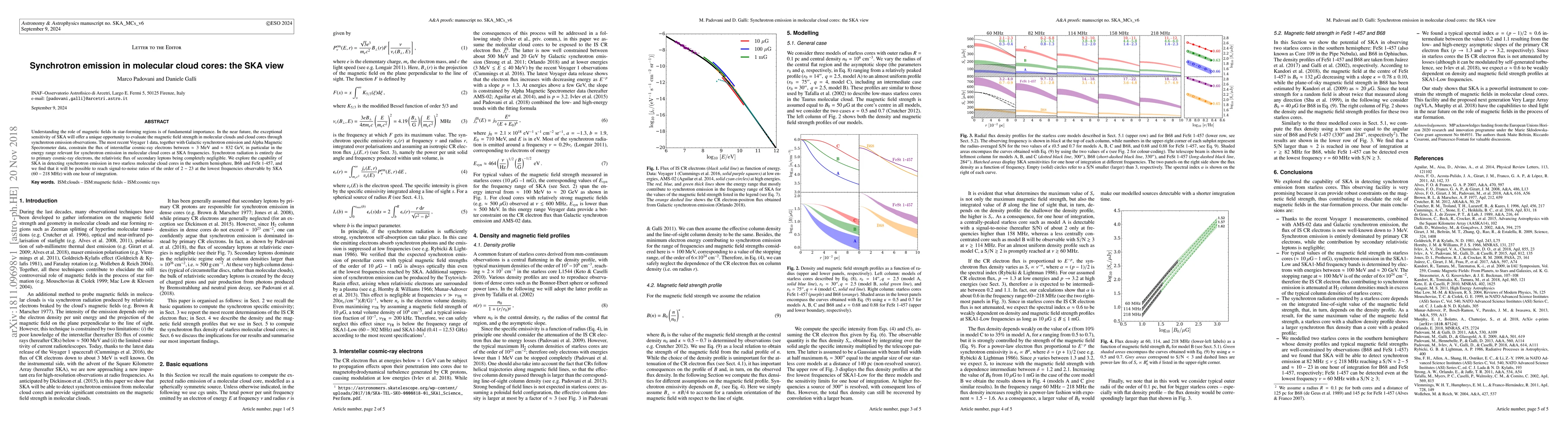 Understanding the role of magnetic fields in star-forming regions is of fundamental importance. In the near future, the exceptional sensitivity of SKA will offer a unique opportunity to evaluate the magnetic field strength in molecular clouds and cloud cores through synchrotron emission observations. The most recent Voyager 1 data, together with Galactic synchrotron emission and Alpha Magnetic Spectrometer data, constrain the flux of interstellar cosmic-ray electrons between $\approx3$ MeV and $\approx832$ GeV, in particular in the energy range relevant for synchrotron emission in molecular cloud cores at SKA frequencies. Synchrotron radiation is entirely due to primary cosmic-ray electrons, the relativistic flux of secondary leptons being completely negligible. We explore the capability of SKA in detecting synchrotron emission in two starless molecular cloud cores in the southern hemisphere, B68 and FeSt 1-457, and we find that it will be possible to reach signal-to-noise ratios of the order of $2-23$ at the lowest frequencies observable by SKA ($60-218$ MHz) with one hour of integration.