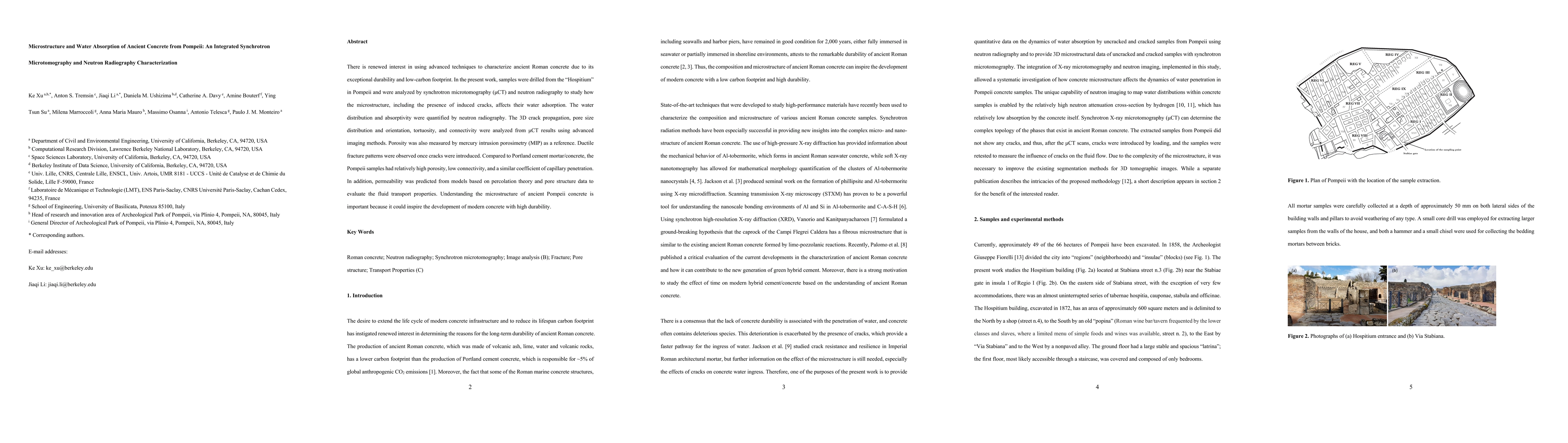 Researchers analyzed ancient Roman concrete from Pompeii using synchrotron microtomography and neutron radiography to study its microstructure and water absorption properties. The findings suggest that the concrete has high porosity and low connectivity compared to modern Portland cement mortar/concrete.