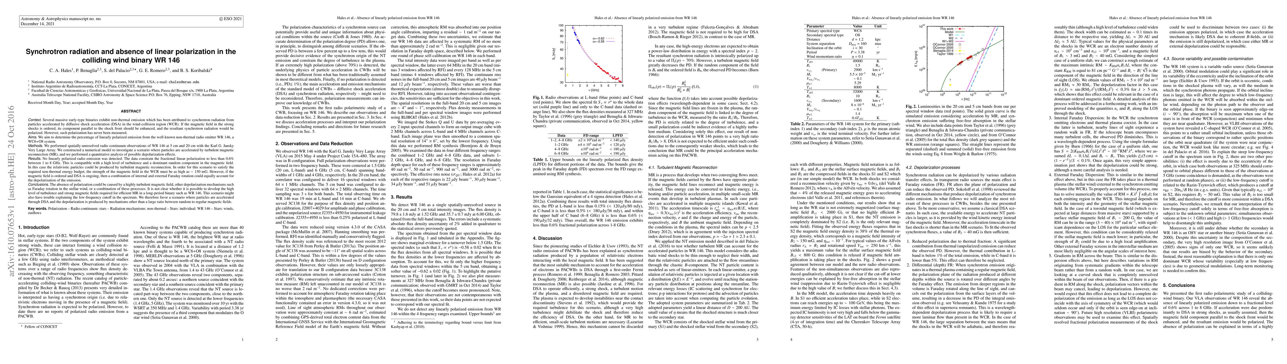 Researchers studied synchrotron radiation in a colliding wind binary WR 146, finding no linear polarization despite high-energy particle acceleration. The data suggest turbulent magnetic reconnection as the most plausible explanation for the absence of polarization.
