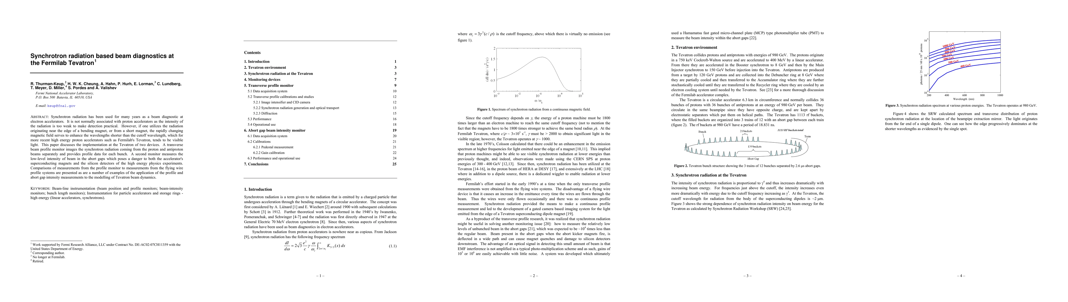 This paper details the use of synchrotron radiation diagnostics at Fermilab's Tevatron proton accelerator, employing enhanced visible light from bending magnets to monitor beam profiles and low-level beam intensity in abort gaps, comparing these measurements with traditional wire profile systems.