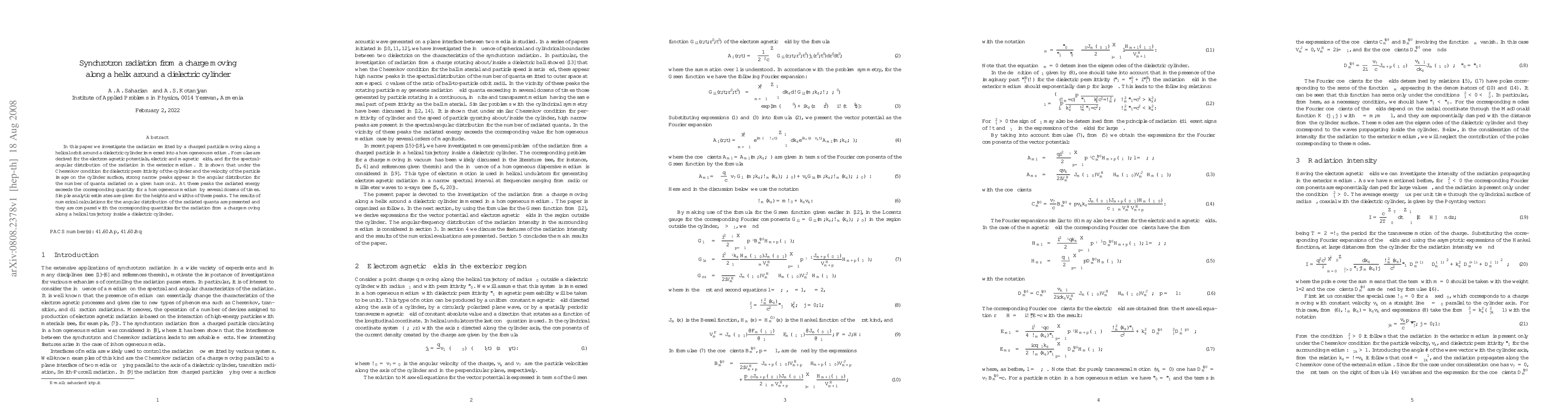 This paper derives expressions for the electromagnetic fields and spectral-angular distribution of synchrotron radiation from a charged particle moving helically around a dielectric cylinder. Strong, narrow peaks in the angular distribution of radiated quanta are observed under the Cherenkov condition, with emitted energy significantly exceeding that in a homogeneous medium.