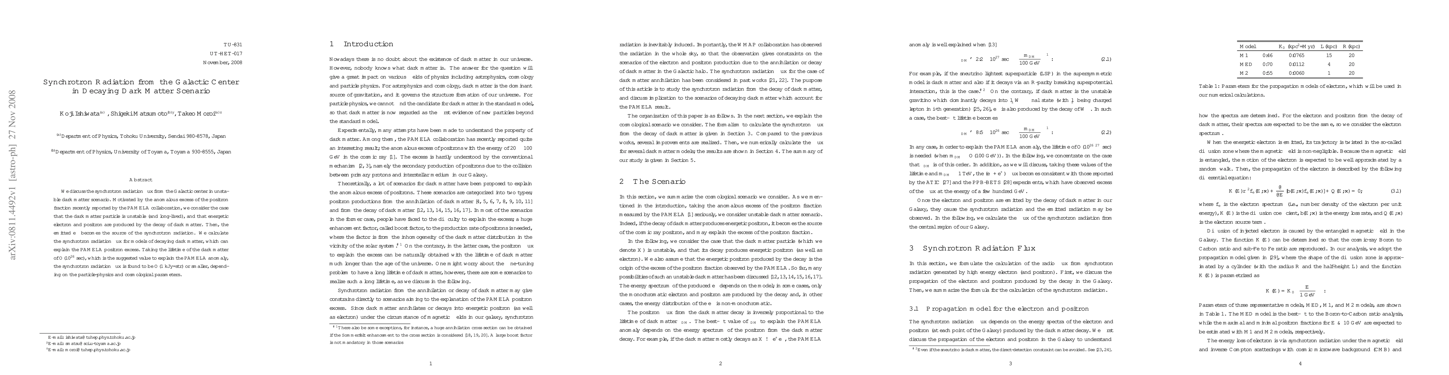 This paper investigates synchrotron radiation from the Galactic center due to the decay of unstable dark matter particles, which could explain the PAMELA collaboration's reported positron excess. The calculated synchrotron radiation flux is found to be O(1 kJy/str) or smaller, contingent on specific dark matter lifetime and cosmological parameters.