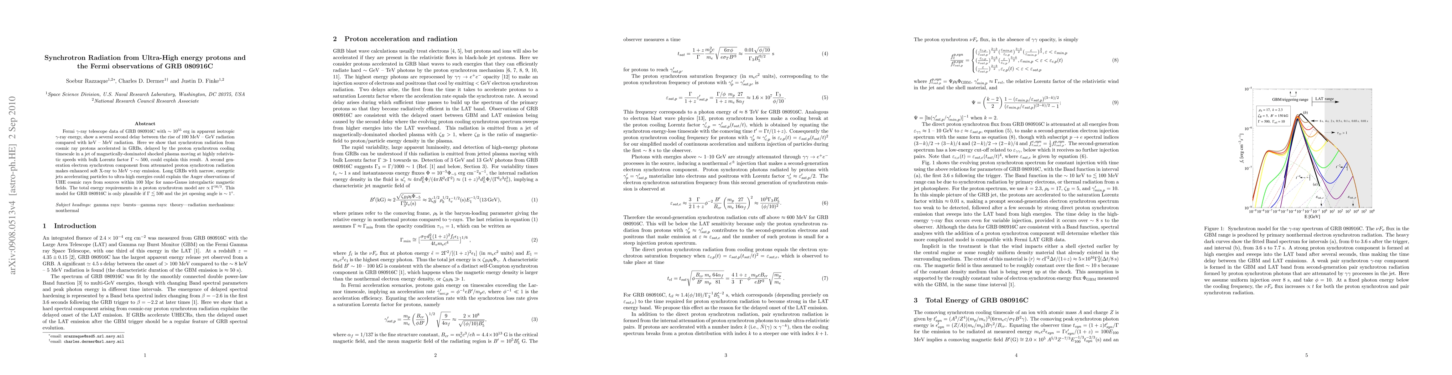 This paper proposes a synchrotron radiation model to explain the observed delay in gamma-ray emissions from GRB 080916C, attributing it to ultra-high energy protons accelerated in the gamma-ray burst. The model suggests that the delay is due to proton synchrotron cooling in a relativistic jet with a Lorentz factor of ~500, and it aligns with observations of ultra-high energy cosmic rays.