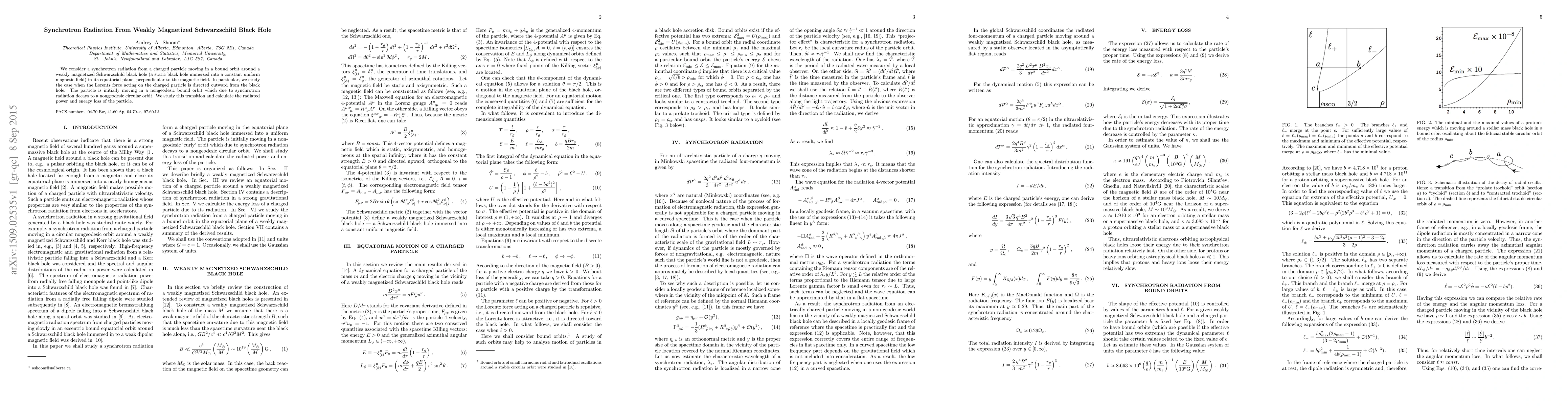 Summary: This study investigates synchrotron radiation emitted by a charged particle in a nongeodesic orbit around a weakly magnetized Schwarzschild black hole, focusing on the transition to a circular orbit due to radiation, and calculating the corresponding radiated power and energy loss.