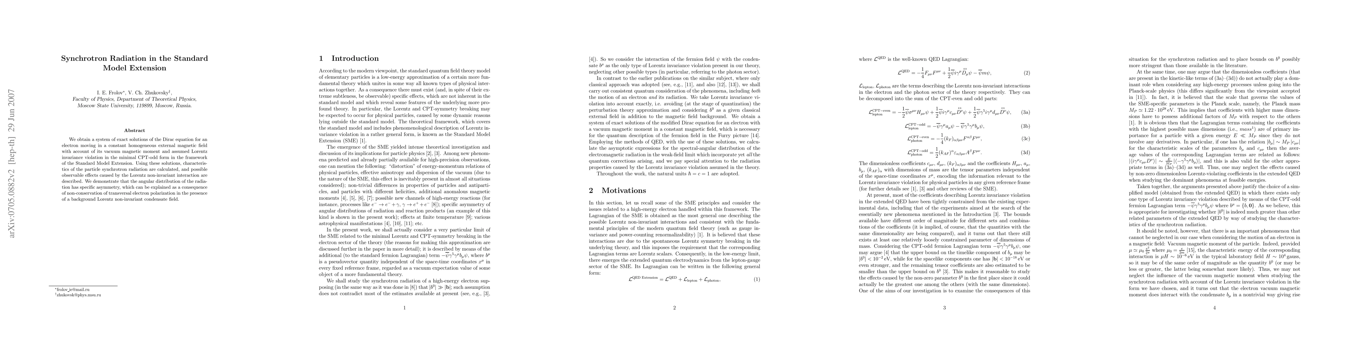 This paper derives exact solutions for the Dirac equation considering an electron's vacuum magnetic moment and Lorentz invariance violation in the Standard Model Extension, then calculates synchrotron radiation characteristics and highlights observable asymmetries in the angular distribution due to non-conservation of transversal electron polarization in a Lorentz non-invariant field.