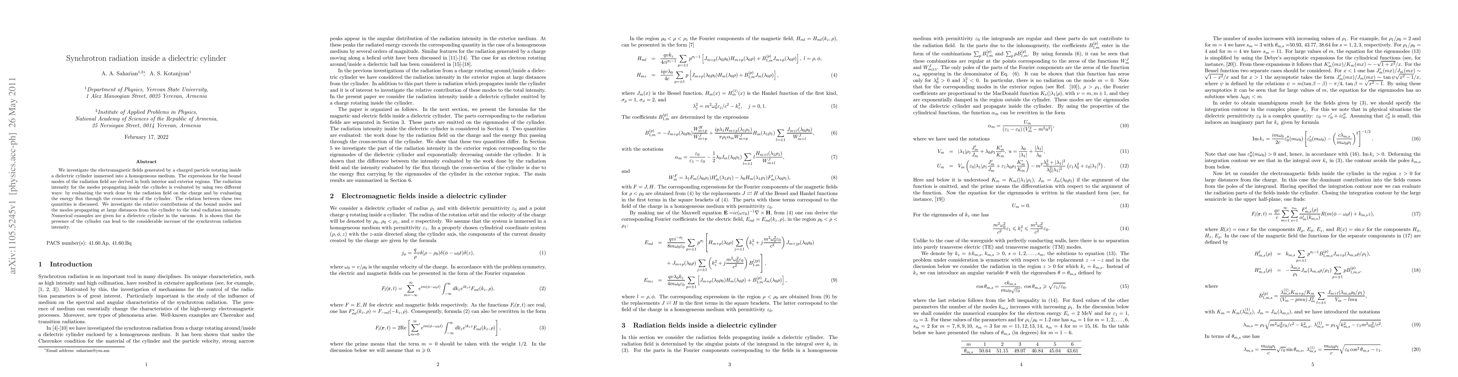 This paper derives expressions for electromagnetic fields from a rotating charged particle inside a dielectric cylinder and evaluates the synchrotron radiation intensity in both the interior and exterior regions. It finds that the cylinder can significantly enhance the radiation intensity compared to vacuum conditions.
