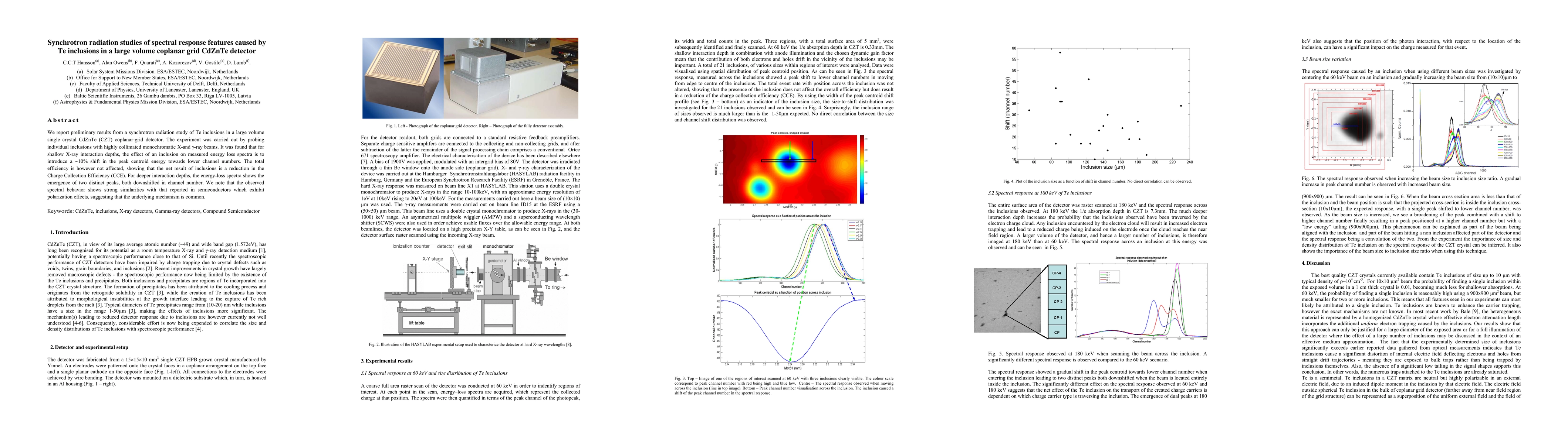 We report preliminary results from a synchrotron radiation study of Te inclusions in a large volume single crystal CdZnTe (CZT) coplanar-grid detector. The experiment was carried out by probing individual inclusions with highly collimated monochromatic X-and gamma-ray beams. It was found that for shallow X-ray interaction depths, the effect of an inclusion on measured energy loss spectra is to introduce a ~10% shift in the peak centroid energy towards lower channel numbers. The total efficiency is however not affected, showing that the net result of inclusions is a reduction in the Charge Collection Efficiency (CCE). For deeper interaction depths, the energy-loss spectra shows the emergence of two distinct peaks, both downshifted in channel number. We note that the observed spectral behavior shows strong similarities with that reported in semiconductors which exhibit polarization effects, suggesting that the underlying mechanism is common.
