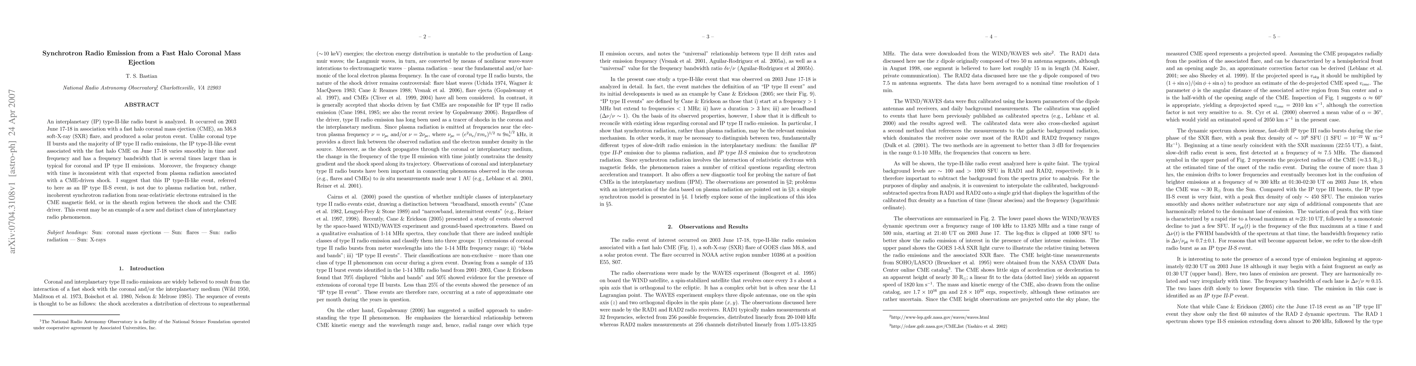 An interplanetary (IP) type-II-like radio burst is analyzed. It occurred on 2003 June 17-18 in association with a fast halo coronal mass ejection (CME), an M6.8 soft-X-ray (SXR) flare, and produced a solar proton event. Unlike coronal type II bursts and the ma jority of IP type II radio emissions, the IP type-II-like event associated with the fast halo CME on June 17-18 varies smoothly in time and frequency and has a frequency bandwidth that is several times larger than is typical for coronal and IP type II emissions. Moreover, the frequency change with time is inconsistent with that expected from plasma radiation associated with a CME-driven shock. I suggest that this IP type-II-like event, referred to here as an IP type II-S event, is not due to plasma radiation but, rather, incoherent synchrotron radiation from near-relativistic electrons entrained in the CME magnetic field, or in the sheath region between the shock and the CME driver. This event may be an example of a new and distinct class of interplanetary radio phenomenon.
