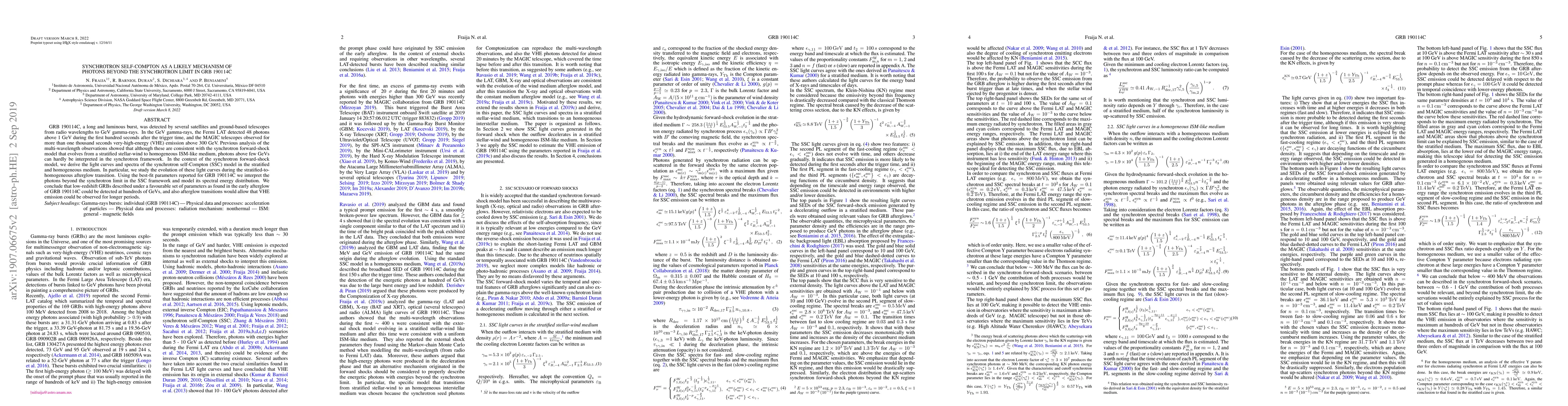 GRB 190114C, a long and luminous burst, was detected by several satellites and ground-based telescopes from radio wavelengths to GeV gamma-rays. In the GeV gamma-rays, the Fermi LAT detected 48 photons above 1 GeV during the first hundred seconds after the trigger time, and the MAGIC telescopes observed for more than one thousand seconds very-high-energy (VHE) emission above 300 GeV. Previous analysis of the multi-wavelength observations showed that although these are consistent with the synchrotron forward-shock model that evolves from a stratified stellar-wind to homogeneous ISM-like medium, photons above few GeVs can hardly be interpreted in the synchrotron framework. In the context of the synchrotron forward-shock model, we derive the light curves and spectra of the synchrotron self-Compton (SSC) model in the stratified and homogeneous medium. In particular, we study the evolution of these light curves during the stratified-to-homogeneous afterglow transition. Using the best-fit parameters reported for GRB 190114C we interpret the photons beyond the synchrotron limit in the SSC framework and model its spectral energy distribution. We conclude that low-redshift GRBs described under a favourable set of parameters as found in the early afterglow of GRB 190114C could be detected at hundreds of GeVs, and also afterglow transitions would allow that VHE emission could be observed for longer periods.