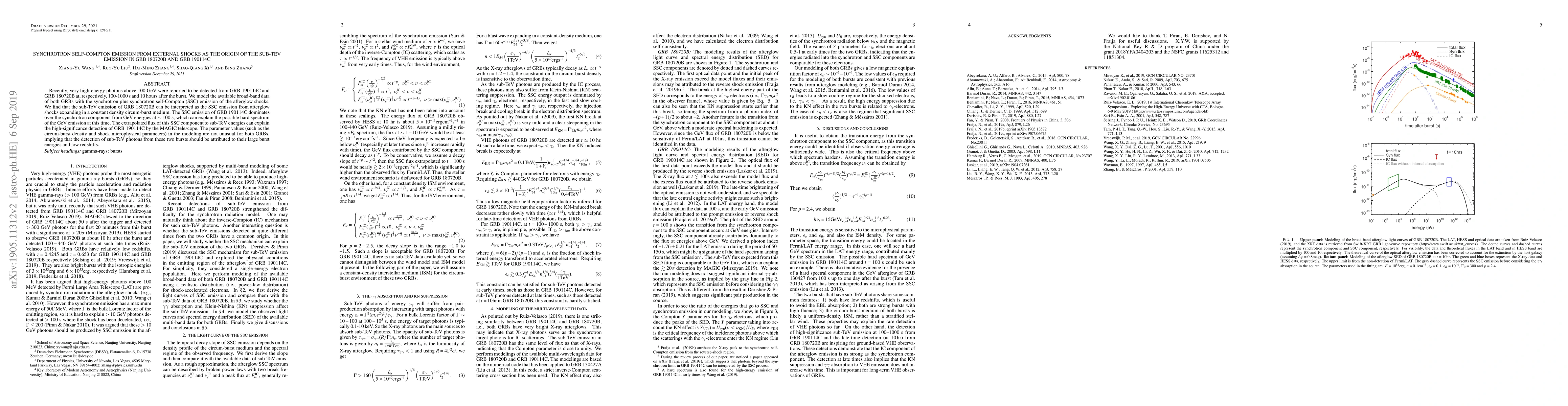 This paper models the sub-TeV emission from GRB 180720B and GRB 190114C, attributing it to synchrotron self-Compton emission from external shocks. The study finds that the SSC emission from afterglow shocks explains the high-energy photons detected in both GRBs, with parameter values consistent with typical GRB characteristics.