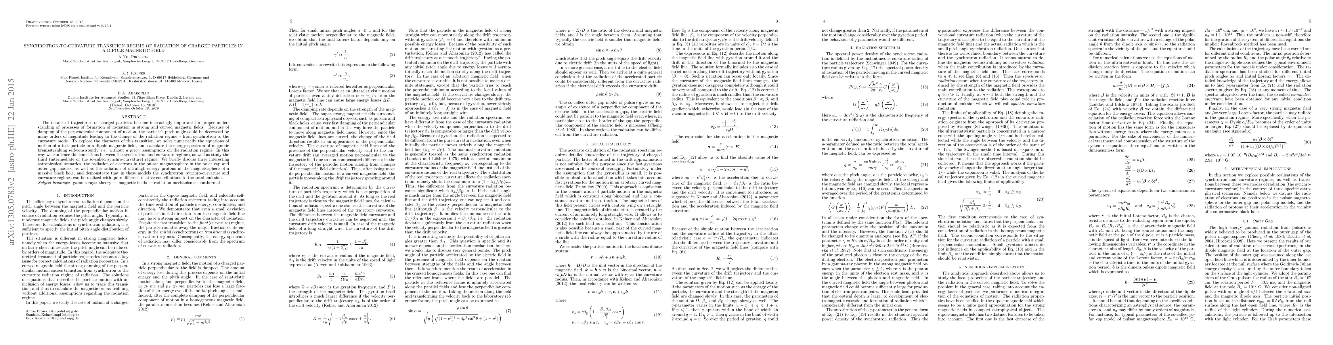 The details of trajectories of charged particles become increasingly important for proper understanding of processes of formation of radiation in strong and curved magnetic fields. Because of damping of the perpendicular component of motion, the particle's pitch angle could be decreased by many orders of magnitude leading to the change of the radiation regime -- from synchrotron to the curvature mode. To explore the character of this transition, we solve numerically the equations of motion of a test particle in a dipole magnetic field, and calculate the energy spectrum of magnetic bremsstrahlung self-consistently, i.e. without a priori assumptions on the radiation regime. In this way we can trace the transitions between the synchrotron and curvature regimes, as well as study the third (intermediate or the so-called synchro-curvature) regime. We briefly discuss three interesting astrophysical scenarios, the radiation of electrons in the pulsar magnetosphere in the polar cap and outer gap models, as well as the radiation of ultrahigh energy protons in the magnetosphere of a massive black hole, and demonstrate that in these models the synchrotron, synchro-curvature and curvature regimes can be realized with quite different relative contributions to the total emission.