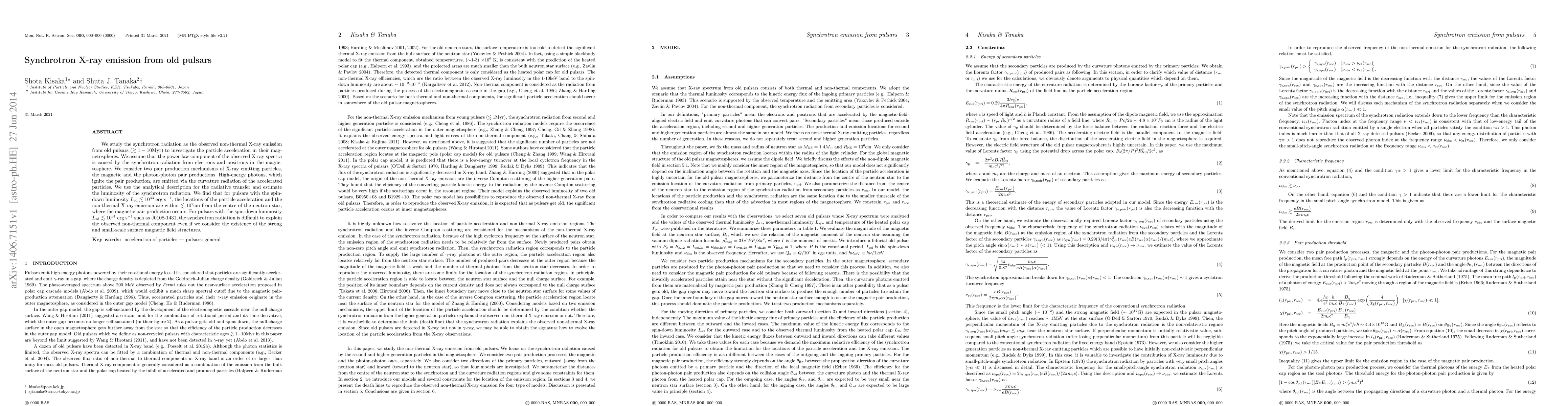 This research investigates the synchrotron X-ray emission from old pulsars, finding that for pulsars with low spin-down luminosity (≲10^33 erg s⁻¹), particle acceleration and non-thermal X-ray emission occur close to the neutron star surface due to magnetic pair production. However, for pulsars with even lower spin-down luminosity (≲10^31 erg s⁻¹), the synchrotron radiation struggles to explain the observed non-thermal component, even with strong surface magnetic field structures.