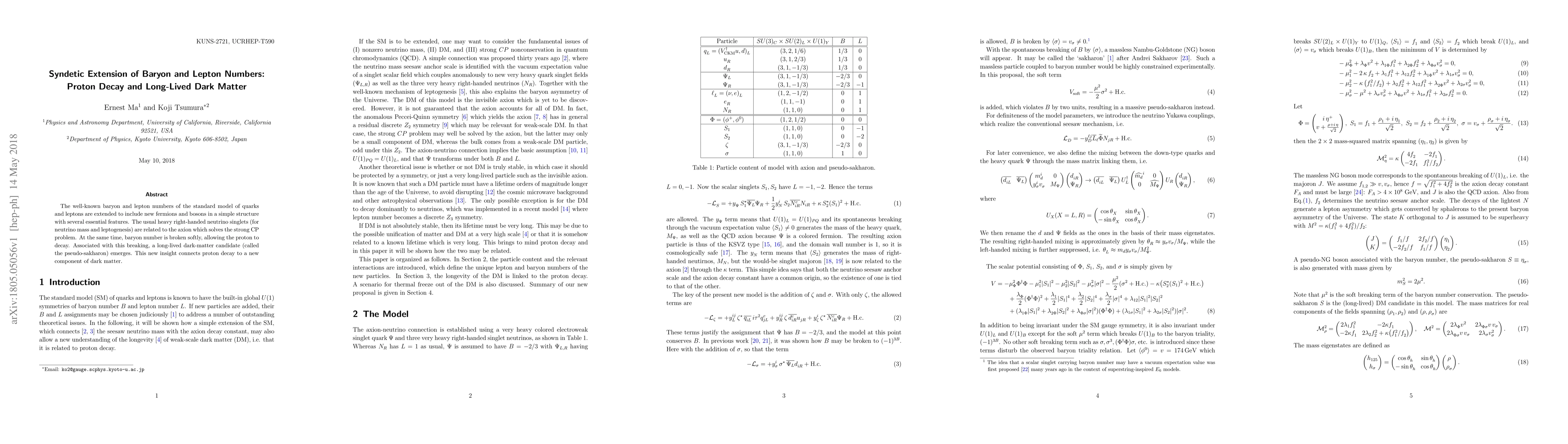 The well-known baryon and lepton numbers of the standard model of quarks and leptons are extended to include new fermions and bosons in a simple structure with several essential features. The usual heavy right-handed neutrino singlets (for neutrino mass and leptogenesis) are related to the axion which solves the strong CP problem. At the same time, baryon number is broken softly, allowing the proton to decay. Associated with this breaking, a long-lived dark-matter candidate (called the pseudo-sakharon) emerges. This new insight connects proton decay to a new component of dark matter.