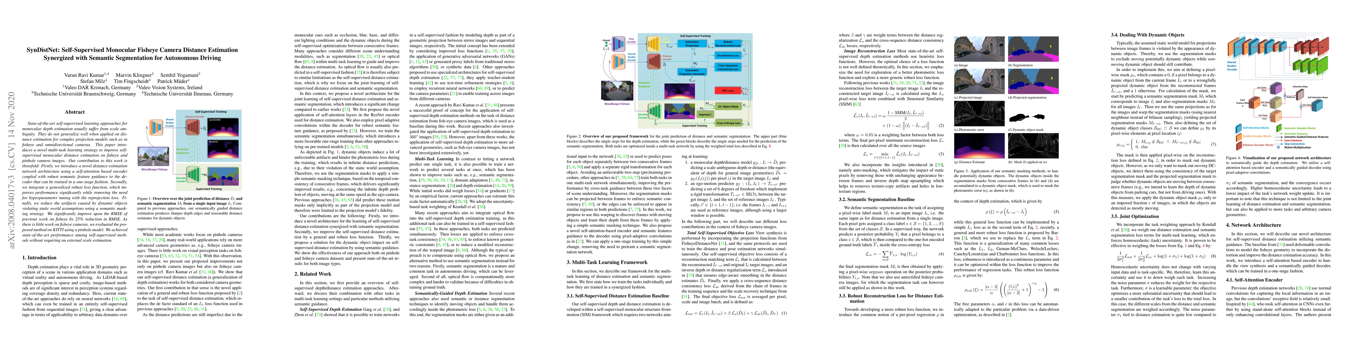 State-of-the-art self-supervised learning approaches for monocular depth estimation usually suffer from scale ambiguity. They do not generalize well when applied on distance estimation for complex projection models such as in fisheye and omnidirectional cameras. This paper introduces a novel multi-task learning strategy to improve self-supervised monocular distance estimation on fisheye and pinhole camera images. Our contribution to this work is threefold: Firstly, we introduce a novel distance estimation network architecture using a self-attention based encoder coupled with robust semantic feature guidance to the decoder that can be trained in a one-stage fashion. Secondly, we integrate a generalized robust loss function, which improves performance significantly while removing the need for hyperparameter tuning with the reprojection loss. Finally, we reduce the artifacts caused by dynamic objects violating static world assumptions using a semantic masking strategy. We significantly improve upon the RMSE of previous work on fisheye by 25% reduction in RMSE. As there is little work on fisheye cameras, we evaluated the proposed method on KITTI using a pinhole model. We achieved state-of-the-art performance among self-supervised methods without requiring an external scale estimation.