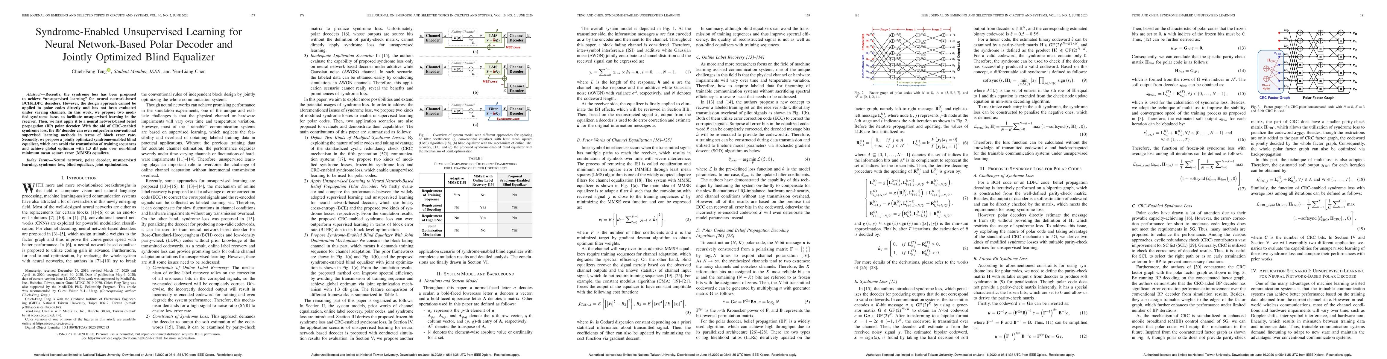 This paper proposes modified syndrome losses for unsupervised learning in neural network-based polar decoders, achieving superior performance compared to supervised methods. It also introduces a jointly optimized blind equalizer that outperforms non-blind alternatives by 1.3 dB, eliminating the need for training sequences.