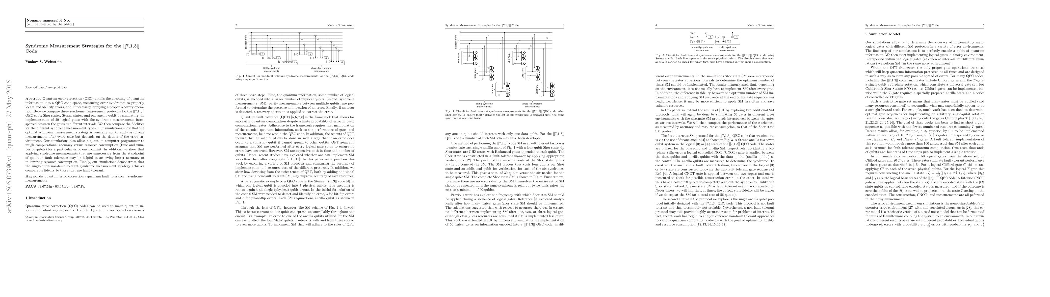 Quantum error correction (QEC) entails the encoding of quantum information into a QEC code space, measuring error syndromes to properly locate and identify errors, and, if necessary, applying a proper recovery operation. Here we compare three syndrome measurement protocols for the [[7,1,3]] QEC code: Shor states, Steane states, and one ancilla qubit by simulating the implementation of 50 logical gates with the syndrome measurements interspersed between the gates at different intervals. We then compare the fidelities for the different syndrome measurement types. Our simulations show that the optimal syndrome measurement strategy is generally not to apply syndrome measurements after every gate but depends on the details of the error environment. Our simulations also allow a quantum computer programmer to weigh computational accuracy versus resource consumption (time and number of qubits) for a particular error environment. In addition, we show that applying syndrome measurements that are unnecessary from the standpoint of quantum fault tolerance may be helpful in achieving better accuracy or in lowering resource consumption. Finally, our simulations demonstrate that the single-qubit non-fault tolerant syndrome measurement strategy achieves comparable fidelity to those that are fault tolerant.