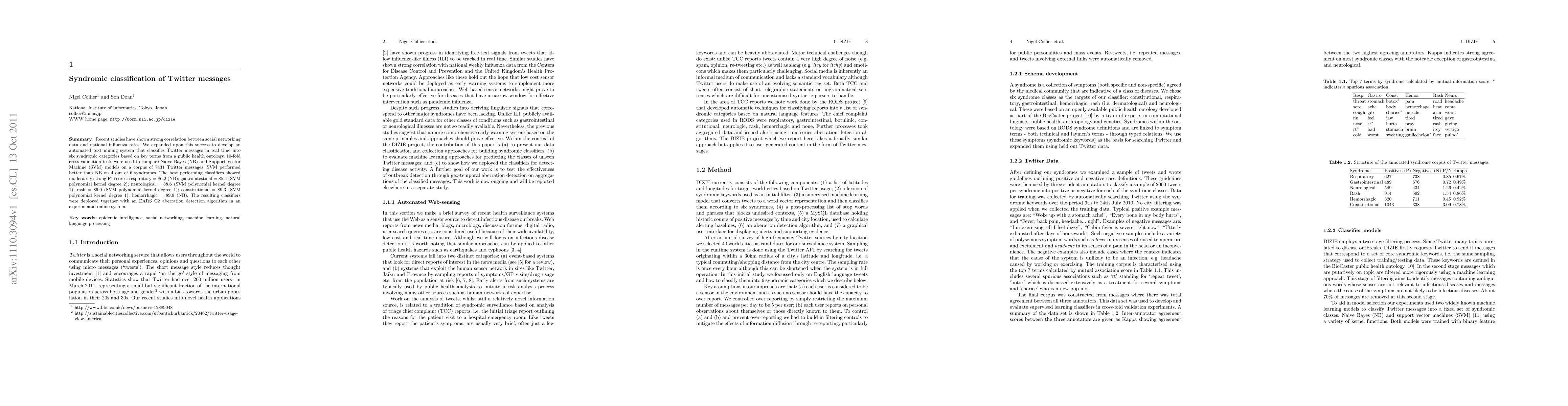 Recent studies have shown strong correlation between social networking data and national influenza rates. We expanded upon this success to develop an automated text mining system that classifies Twitter messages in real time into six syndromic categories based on key terms from a public health ontology. 10-fold cross validation tests were used to compare Naive Bayes (NB) and Support Vector Machine (SVM) models on a corpus of 7431 Twitter messages. SVM performed better than NB on 4 out of 6 syndromes. The best performing classifiers showed moderately strong F1 scores: respiratory = 86.2 (NB); gastrointestinal = 85.4 (SVM polynomial kernel degree 2); neurological = 88.6 (SVM polynomial kernel degree 1); rash = 86.0 (SVM polynomial kernel degree 1); constitutional = 89.3 (SVM polynomial kernel degree 1); hemorrhagic = 89.9 (NB). The resulting classifiers were deployed together with an EARS C2 aberration detection algorithm in an experimental online system.