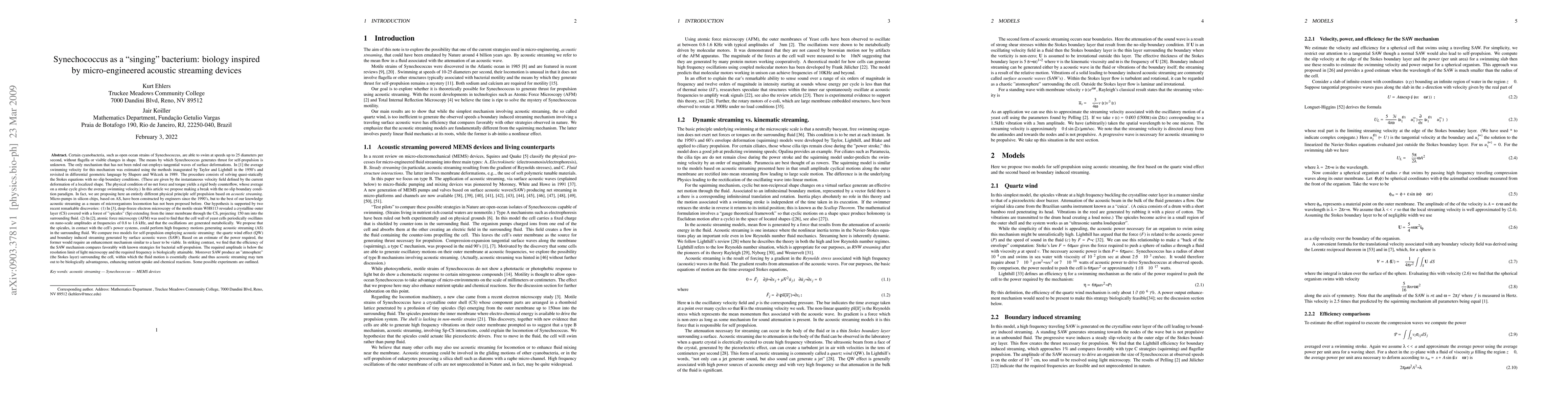 Certain cyanobacteria, such as open ocean strains of Synechococcus, are able to swim at speeds up to 25 diameters per second, without flagella or visible changes in shape. The means by which Synechococcus generates thrust for self-propulsion is unknown. The only mechanism that has not been ruled out employs tangential waves of surface deformations. In Ehlers et al, the average swimming velocity for this mechanism was estimated using the methods inaugurated by Taylor and Lighthill in the 1950's and revisited in differential geometric language by Shapere and Wilczek in 1989. In this article we propose an entirely different physical principle self propulsion based on acoustic streaming (AS). Micro-pumps in silicon chips, based on AS, have been constructed by engineers since the 1990's, but to the best of our knowledge acoustic streaming as a means of microorganisms locomotion has not been proposed before. Our hypothesis is supported by two recent discoveries: (1) In Samuel, et al, deep-freeze electron microscopy of the motile strain WH8113 revealed a crystalline outer layer (CS) covered with a forest of "spicules" (Sp) extending from the inner membrane through the CS, projecting 150 nm into the surrounding fluid. (2) In Pelling et al, atomic force microscopy (AFM) was used to find that the cell wall of yeast cells periodically oscillates on nano-scale amplitudes at frequencies of 0.8 to 1.6 kHz, and that the oscillations are generated metabolically. We propose that the spicules, in contact with the cell's power systems, could perform high frequency motions generating acoustic streaming (AS) in the surrounding fluid. We compare two models for self-propulsion employing acoustic streaming: the quartz wind effect (QW) and boundary induced streaming generated by surface acoustic waves (SAW).