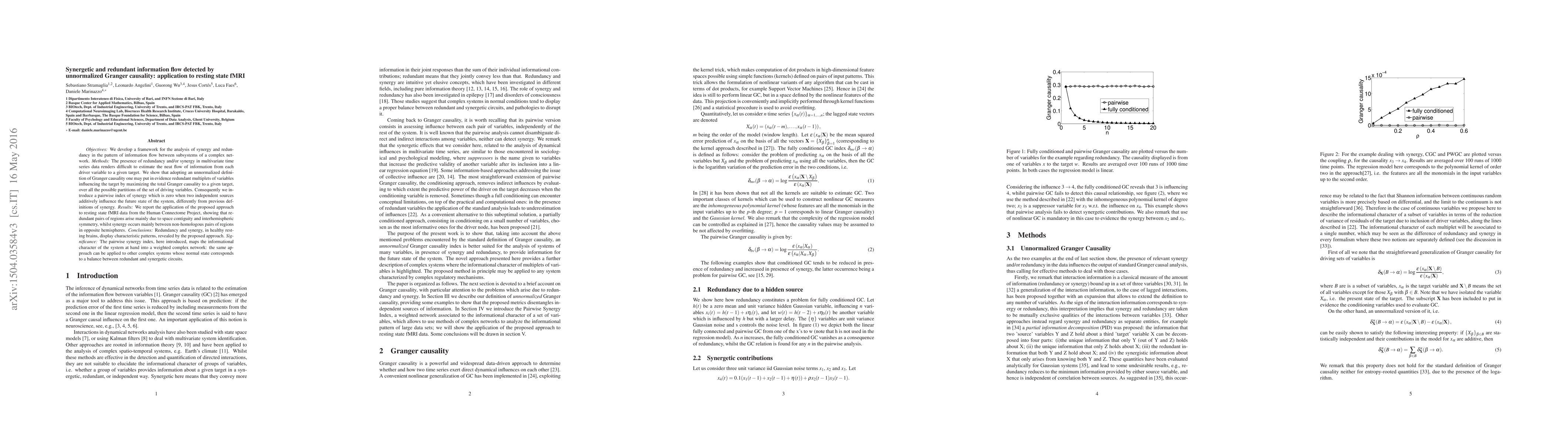 Objectives: We develop a framework for the analysis of synergy and redundancy in the pattern of information flow between subsystems of a complex network. Methods: The presence of redundancy and/or synergy in multivariate time series data renders difficult to estimate the neat flow of information from each driver variable to a given target. We show that adopting an unnormalized definition of Granger causality one may put in evidence redundant multiplets of variables influencing the target by maximizing the total Granger causality to a given target, over all the possible partitions of the set of driving variables. Consequently we introduce a pairwise index of synergy which is zero when two independent sources additively influence the future state of the system, differently from previous definitions of synergy. Results: We report the application of the proposed approach to resting state fMRI data from the Human Connectome Project, showing that redundant pairs of regions arise mainly due to space contiguity and interhemispheric symmetry, whilst synergy occurs mainly between non-homologous pairs of regions in opposite hemispheres. Conclusions: Redundancy and synergy, in healthy resting brains, display characteristic patterns, revealed by the proposed approach. Significance: The pairwise synergy index, here introduced, maps the informational character of the system at hand into a weighted complex network: the same approach can be applied to other complex systems whose normal state corresponds to a balance between redundant and synergetic circuits.