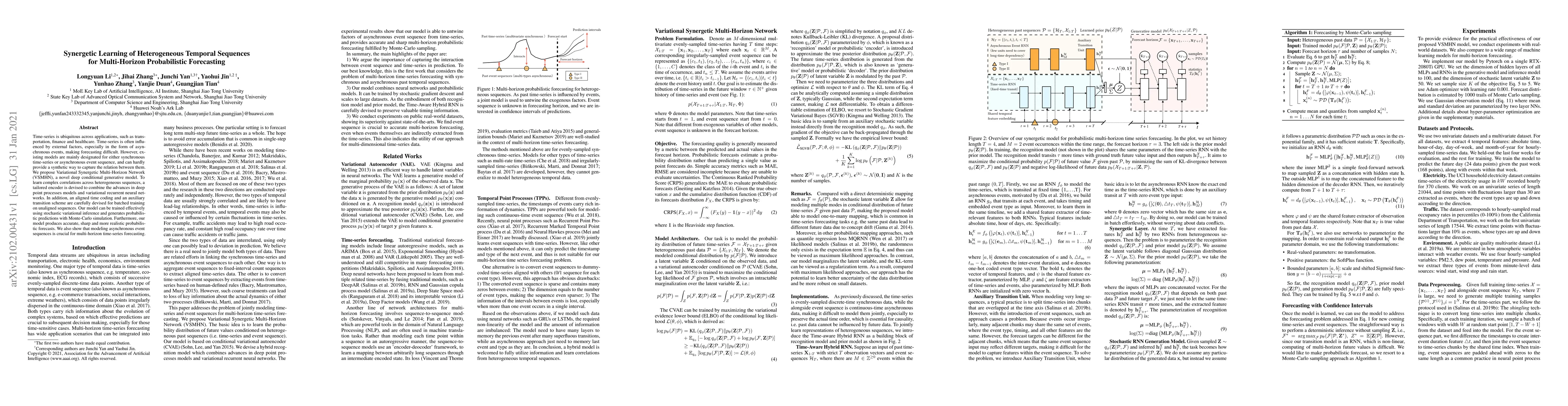 This paper introduces the Variational Synergetic Multi-Horizon Network (VSMHN) to address the challenge of forecasting time-series influenced by asynchronous events. The model combines deep point processes and variational recurrent neural networks to capture complex correlations across heterogeneous sequences, providing accurate, sharp, and realistic probabilistic forecasts.