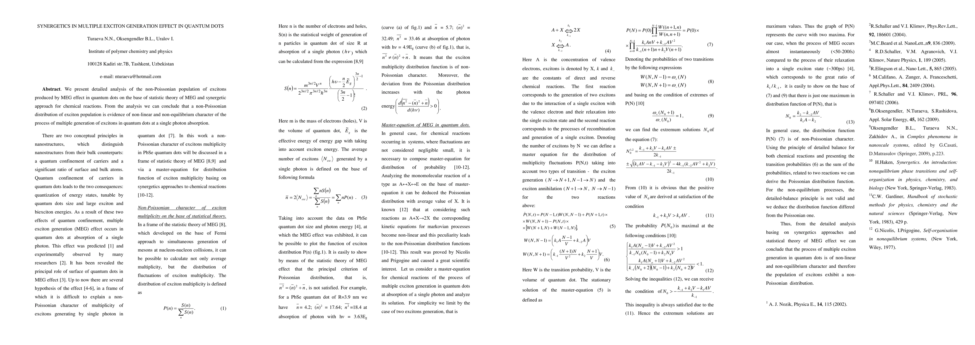 We present detailed analysis of the non-Poissonian population of excitons produced by MEG effect in quantum dots on the base of statistic theory of MEG and synergetic approach for chemical reactions. From the analysis we can conclude that a non-Poissonian distribution of exciton population is evidence of non-linear and non-equilibrium character of the process of multiple generation of excitons in quantum dots at a single photon absorption