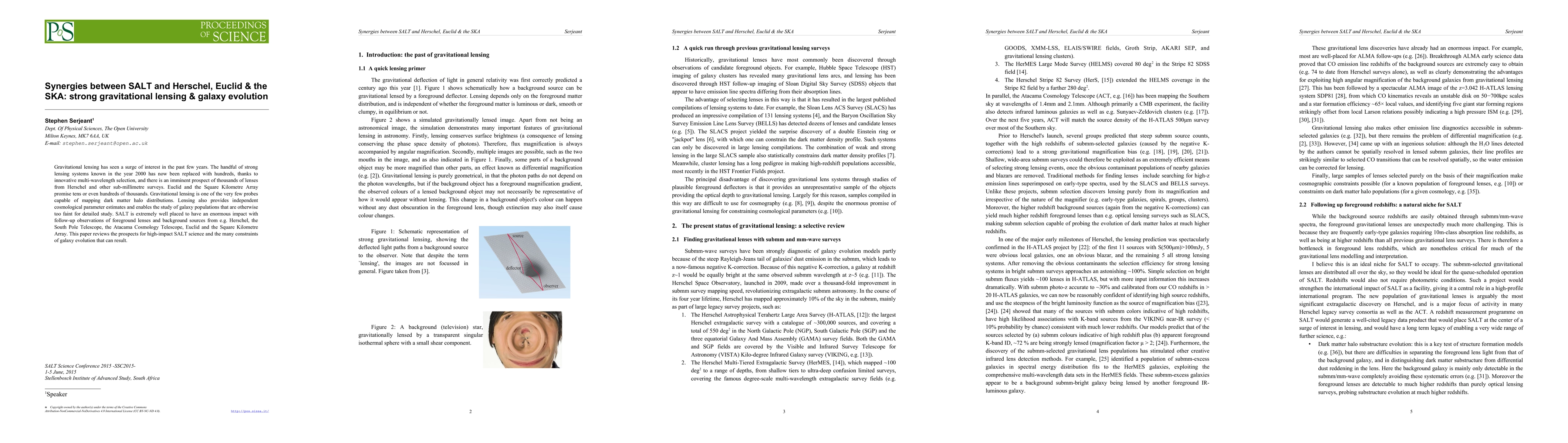 This paper explores the synergies between SALT and upcoming astronomical surveys like Herschel, Euclid, and the SKA, emphasizing the potential of strong gravitational lensing to study dark matter and galaxy evolution. SALT is poised to significantly contribute to follow-up observations, providing insights into the distribution of dark matter and the characteristics of faint galaxies.