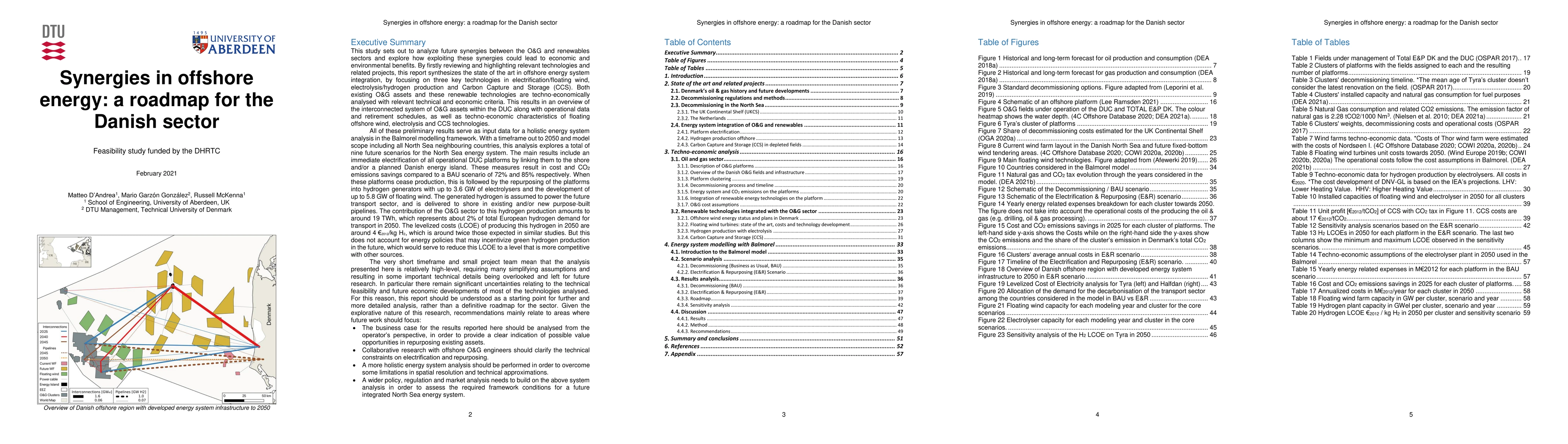 This study sets out to analyze future synergies between the O&G and renewables sectors and explore how exploiting these synergies could lead to economic and environmental benefits. By firstly reviewing and highlighting relevant technologies and related projects, this report synthesizes the state of the art in offshore energy system integration, by focusing on three key technologies in electrification/floating wind, electrolysis/hydrogen production and Carbon Capture and Storage (CCS). With a timeframe out to 2050 and model scope including all North Sea neighbouring countries, this analysis explores a total of nine future scenarios for the North Sea energy system. The main results include an immediate electrification of all operational DUC platforms by linking them to the shore and/or a planned Danish energy island. These measures result in cost and CO2 emissions savings compared to a BAU scenario of 72% and 85% respectively. When these platforms cease production, this is followed by the repurposing of the platforms into hydrogen generators with up to 3.6 GW of electrolysers and the development of up to 5.8 GW of floating wind. The generated hydrogen is assumed to power the future transport sector, and is delivered to shore in existing and/or new purpose-built pipelines. The contribution of the O&G sector to this hydrogen production amounts to around 19 TWh, which represents about 2% of total European hydrogen demand for transport in 2050. The levelized costs (LCOE) of producing this hydrogen in 2050 are around 4 euro2012/kg H2, which is around twice those expected in similar studies. But this does not account for energy policies that may incentivize green hydrogen production in the future, which would serve to reduce this LCOE to a level that is more competitive with other sources.