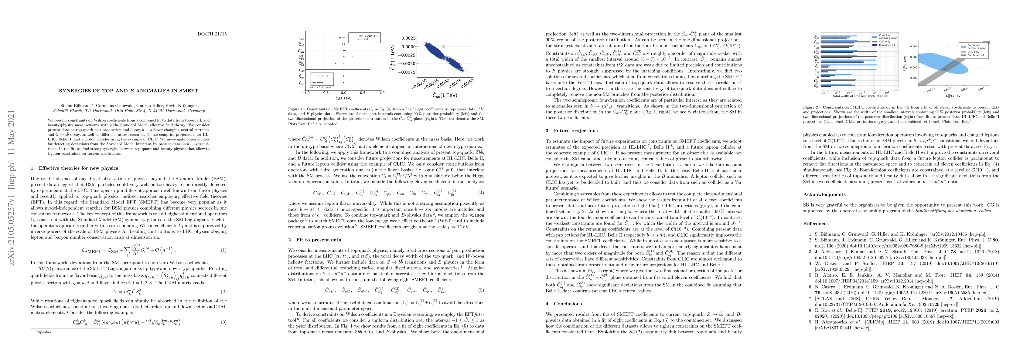 We present constraints on Wilson coefficients from a combined fit to data from top-quark and beauty-physics measurements within the Standard Model effective field theory. We consider present data on top-quark pair production and decay, $b\to s$ flavor changing neutral currents, and $Z\to b\bar b$ decay, as well as different future scenarios. These comprise projections for HL-LHC, Belle II, and a lepton collider using the example of CLIC. We investigate opportunities for detecting deviations from the Standard Model hinted at by present data on $b\to s$ transitions. In the fit, we find strong synergies between top-quark and beauty physics that allow to tighten constraints on various coefficients.