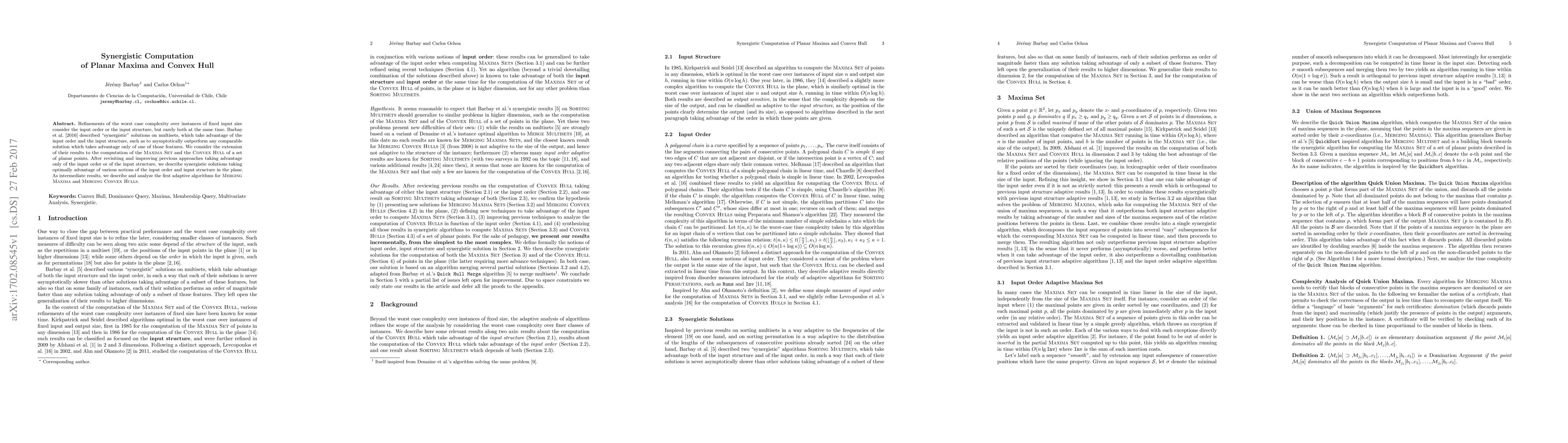 This paper presents synergistic computation methods for finding planar maxima and convex hulls, which leverage both input order and structure to achieve better performance. The research aims to optimize computational complexity and provide new insights into adaptive algorithms for merging maxima and convex hulls.