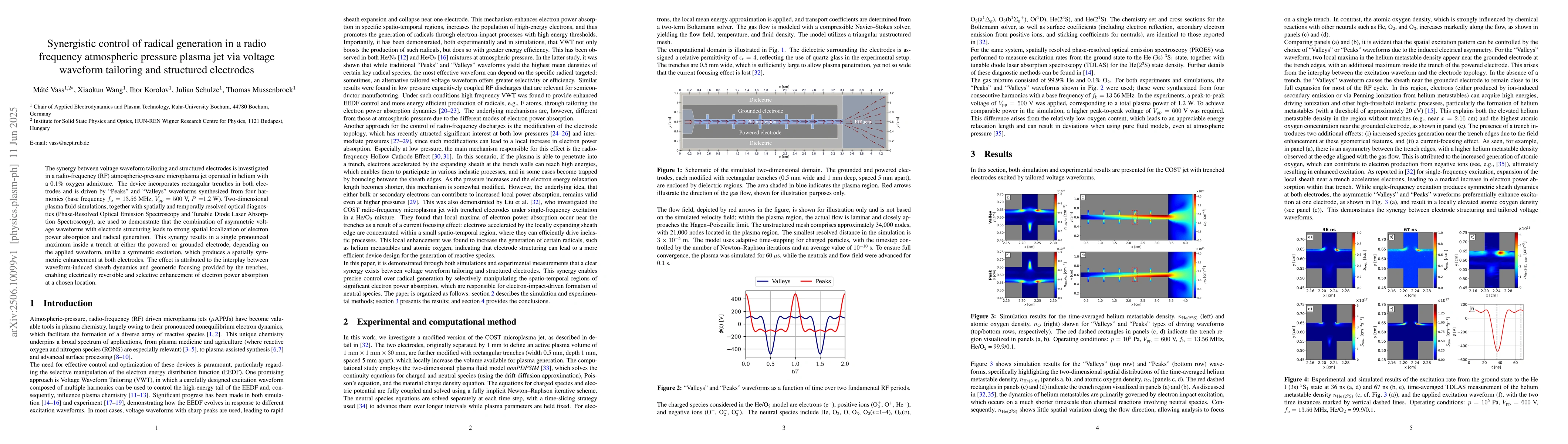 Researchers investigated synergy between voltage waveform tailoring and structured electrodes in a radio-frequency plasma jet, achieving strong spatial localization of radical generation through asymmetric waveforms and electrode design.