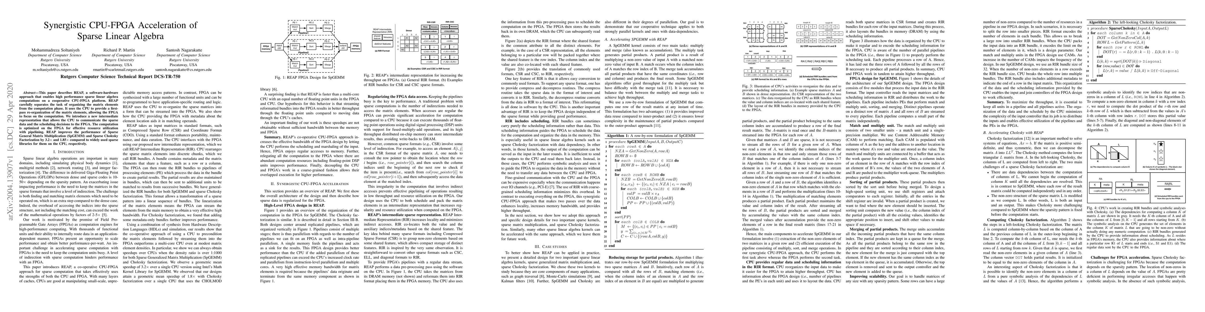 This paper presents REAP, a cooperative CPU-FPGA framework for accelerating sparse linear algebra computations, achieving a 3.2X improvement in SpGEMM and 1.85X in Sparse Cholesky Factorization compared to CPU-only methods. REAP separates matrix reorganization from computation, optimizing FPGA pipelining for enhanced performance.