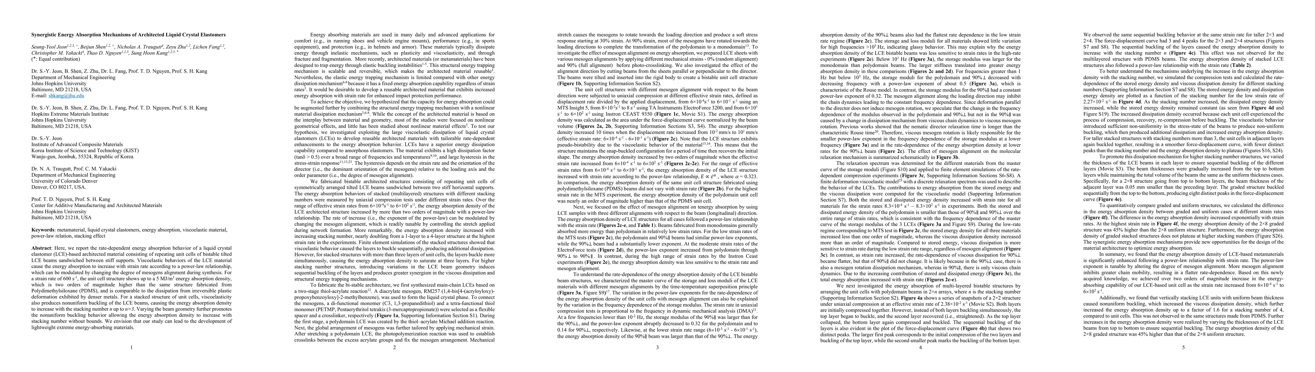 Researchers developed a new type of energy-absorbing material that can absorb up to 5 MJ/m3 of energy, outperforming traditional materials like Polydimethylsiloxane (PDMS). The material's unique structure and geometry allow it to increase energy absorption with strain rate and stacking number.