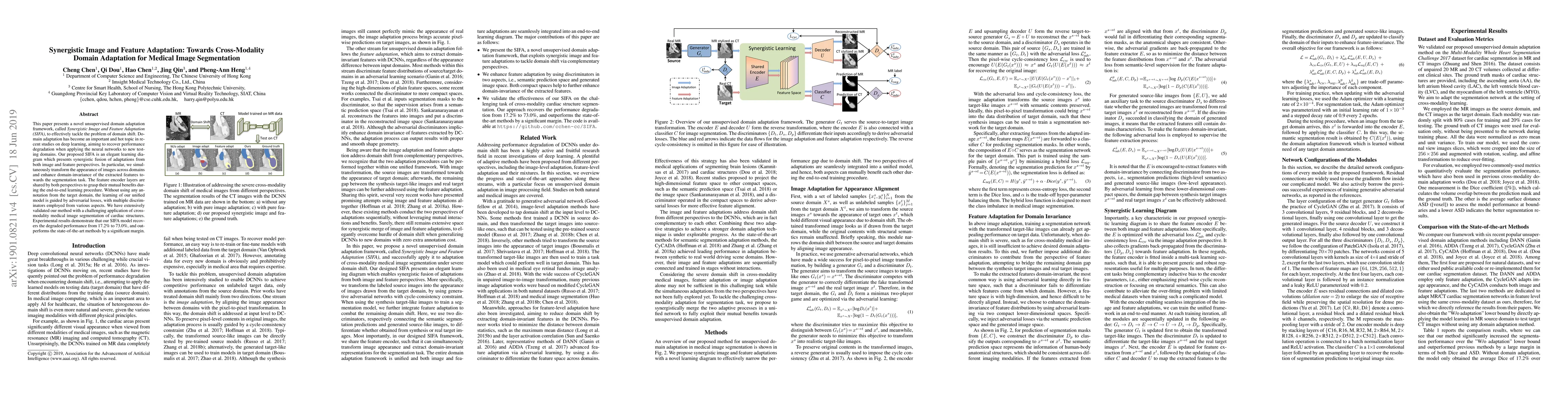 This paper introduces Synergistic Image and Feature Adaptation (SIFA) for unsupervised domain adaptation in medical image segmentation, achieving significant performance improvements by transforming image appearance and enhancing feature domain-invariance without target domain annotations. SIFA outperforms existing methods, recovering degraded performance by 55.8% in cardiac structure segmentation.