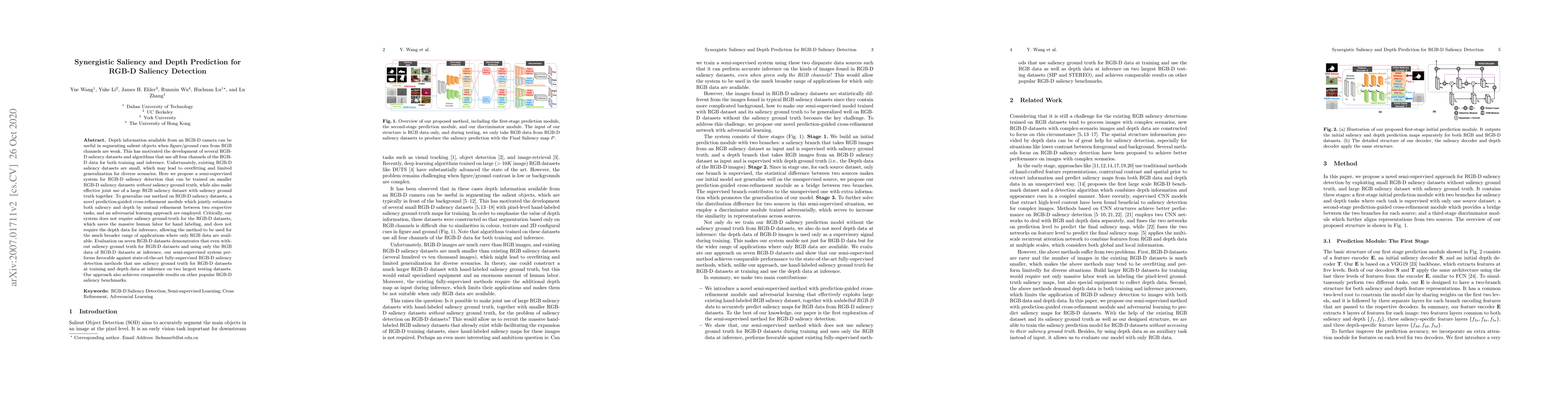 This research proposes a semi-supervised system for RGB-D saliency detection that leverages both small RGB-D datasets without ground truth and large RGB datasets with ground truth. The system uses a prediction-guided cross-refinement module and adversarial learning to jointly estimate saliency and depth, achieving competitive performance against fully-supervised methods.