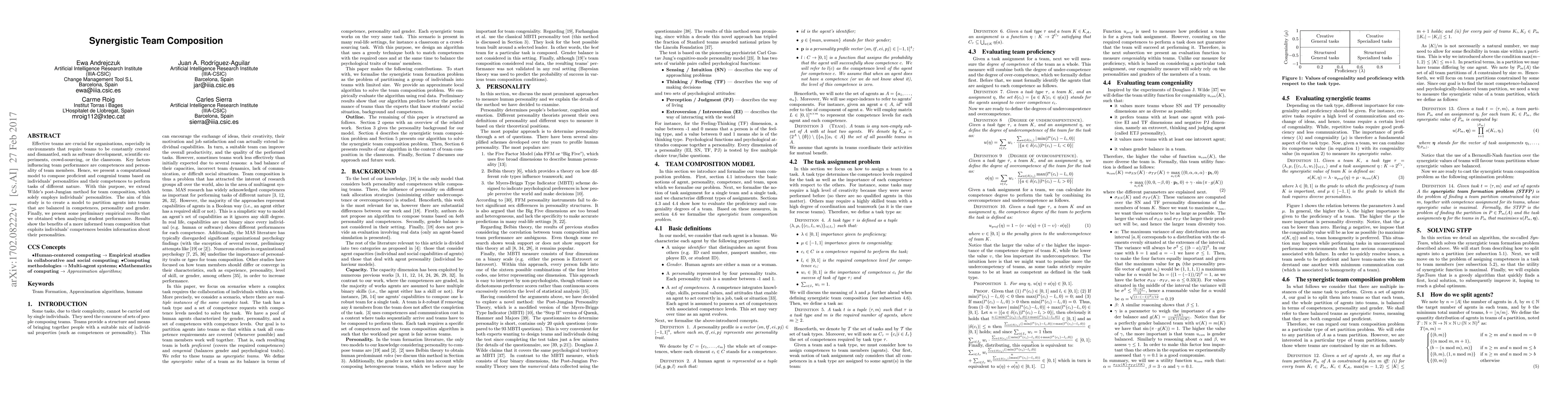 Effective teams are crucial for organisations, especially in environments that require teams to be constantly created and dismantled, such as software development, scientific experiments, crowd-sourcing, or the classroom. Key factors influencing team performance are competences and personality of team members. Hence, we present a computational model to compose proficient and congenial teams based on individuals' personalities and their competences to perform tasks of different nature. With this purpose, we extend Wilde's post-Jungian method for team composition, which solely employs individuals' personalities. The aim of this study is to create a model to partition agents into teams that are balanced in competences, personality and gender. Finally, we present some preliminary empirical results that we obtained when analysing student performance. Results show the benefits of a more informed team composition that exploits individuals' competences besides information about their personalities.