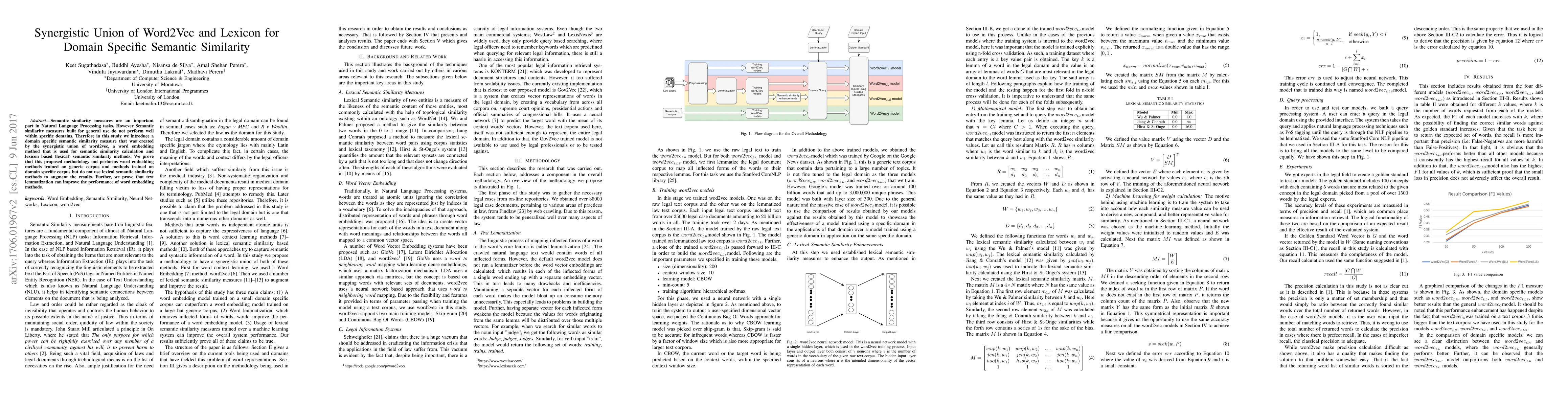 Semantic similarity measures are an important part in Natural Language Processing tasks. However Semantic similarity measures built for general use do not perform well within specific domains. Therefore in this study we introduce a domain specific semantic similarity measure that was created by the synergistic union of word2vec, a word embedding method that is used for semantic similarity calculation and lexicon based (lexical) semantic similarity methods. We prove that this proposed methodology out performs word embedding methods trained on generic corpus and methods trained on domain specific corpus but do not use lexical semantic similarity methods to augment the results. Further, we prove that text lemmatization can improve the performance of word embedding methods.