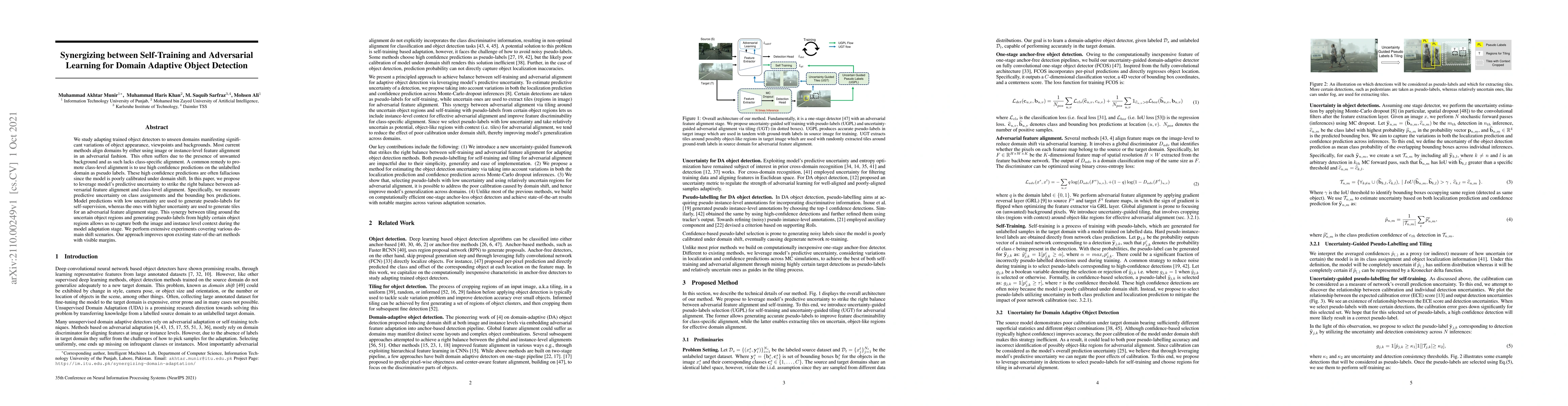 We study adapting trained object detectors to unseen domains manifesting significant variations of object appearance, viewpoints and backgrounds. Most current methods align domains by either using image or instance-level feature alignment in an adversarial fashion. This often suffers due to the presence of unwanted background and as such lacks class-specific alignment. A common remedy to promote class-level alignment is to use high confidence predictions on the unlabelled domain as pseudo labels. These high confidence predictions are often fallacious since the model is poorly calibrated under domain shift. In this paper, we propose to leverage model predictive uncertainty to strike the right balance between adversarial feature alignment and class-level alignment. Specifically, we measure predictive uncertainty on class assignments and the bounding box predictions. Model predictions with low uncertainty are used to generate pseudo-labels for self-supervision, whereas the ones with higher uncertainty are used to generate tiles for an adversarial feature alignment stage. This synergy between tiling around the uncertain object regions and generating pseudo-labels from highly certain object regions allows us to capture both the image and instance level context during the model adaptation stage. We perform extensive experiments covering various domain shift scenarios. Our approach improves upon existing state-of-the-art methods with visible margins.