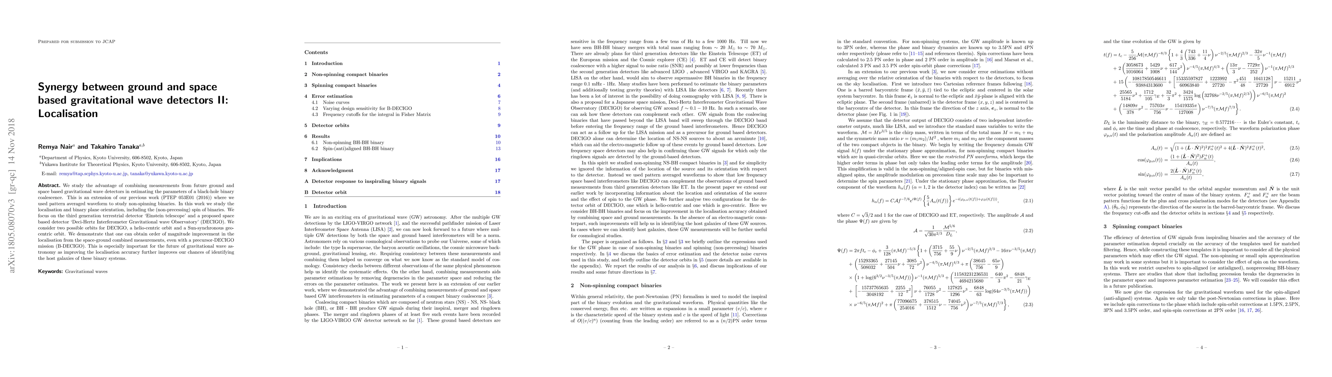 We study the advantage of combining measurements from future ground and space based gravitational wave detectors in estimating the parameters of a black-hole binary coalescence. This is an extension of our previous work (PTEP 053E01 (2016)) where we used pattern averaged waveform to study non-spinning binaries. In this work we study the localisation and binary plane orientation, including the (non-precessing) spin of binaries. We focus on the third generation terrestrial detector `Einstein telescope' and a proposed space based detector `Deci-Hertz Interferometer Gravitational wave Observatory' (DECIGO). We consider two possible orbits for DECIGO, a heliocentric orbit and a Sun-synchronous geocentric orbit. We demonstrate that one can obtain order of magnitude improvement in the localisation from the space-ground combined measurements, even with a precursor-DECIGO mission (B-DECIGO). This is especially important for the future of gravitational wave astronomy as improving the localisation accuracy further improves our chances of identifying the host galaxies of these binary systems.