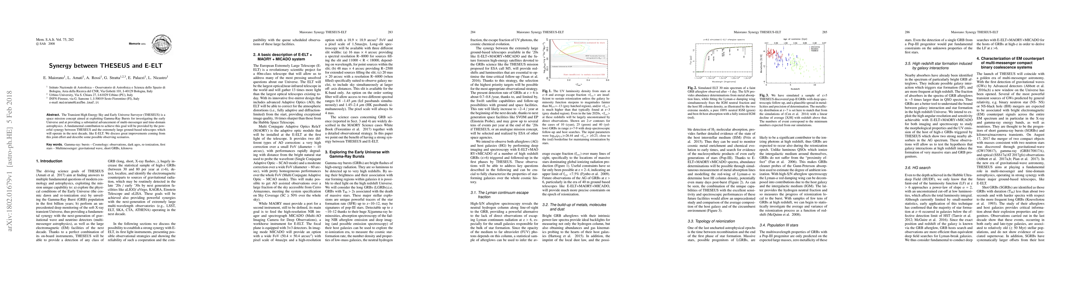 The THESEUS space mission aims to study Gamma-Ray Bursts and advance multi-messenger astrophysics, with significant enhancements expected through its synergy with the E-ELT, a large ground-based telescope. This collaboration promises substantial improvements in observing scenarios for early Universe research.