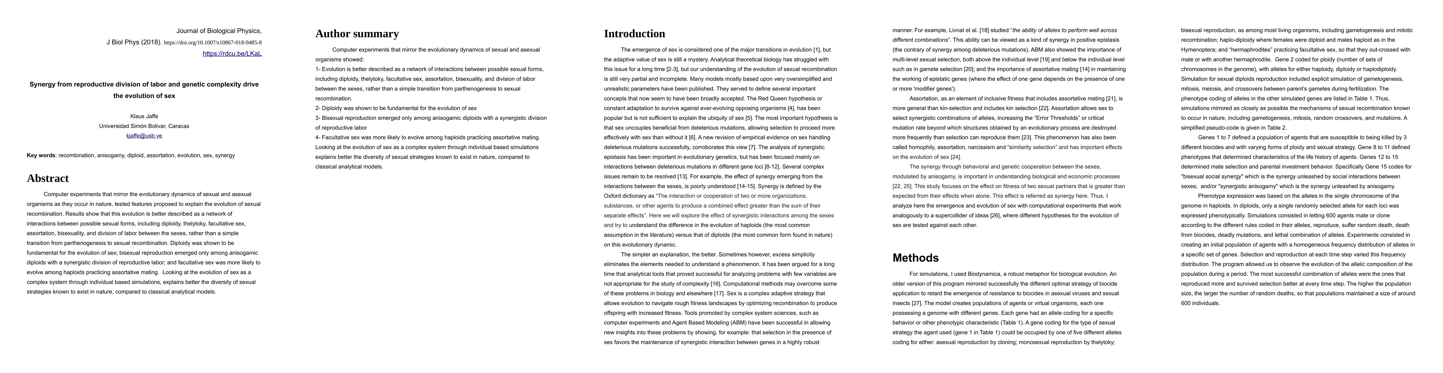 Computer experiments that mirror the evolutionary dynamics of sexual and asexual organisms as they occur in nature, tested features proposed to explain the evolution of sexual recombination. Results show that this evolution is better described as a network of interactions between possible sexual forms, including diploidy, thelytoky, facultative sex, assortation, bisexuality, and division of labor between the sexes, rather than a simple transition from parthenogenesis to sexual recombination. Diploidy was shown to be fundamental for the evolution of sex; bisexual reproduction emerged only among anisogamic diploids with a synergistic division of reproductive labor; and facultative sex was more likely to evolve among haploids practicing assortative mating. Looking at the evolution of sex as a complex system through individual based simulations, explains better the diversity of sexual strategies known to exist in nature, compared to classical analytical models