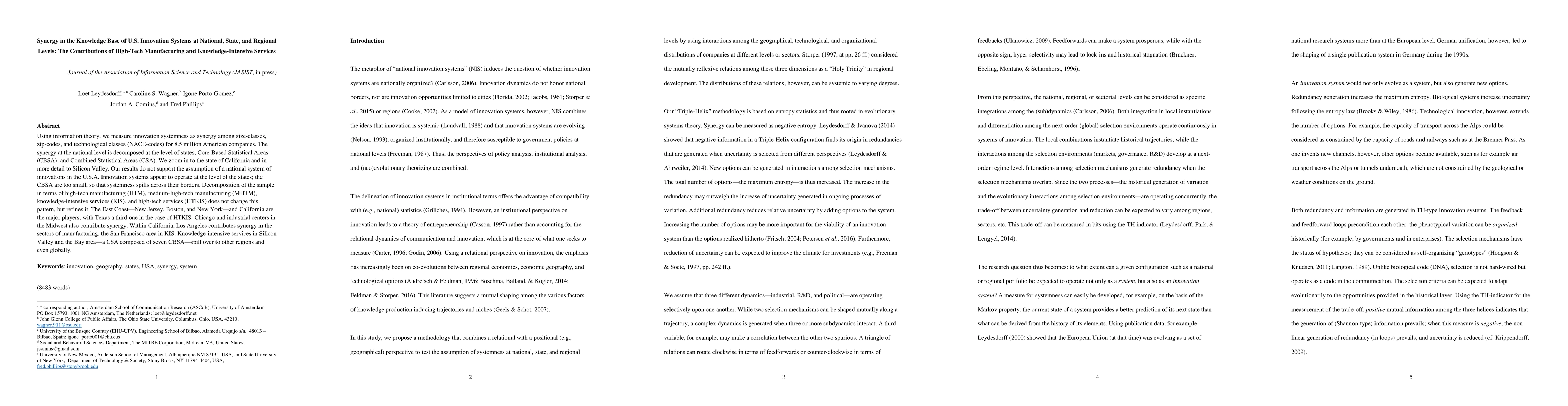 This paper uses information theory to analyze the synergy within U.S. innovation systems across national, state, and regional levels, finding that innovation systems primarily operate at the state level rather than nationally. High-tech services and knowledge-intensive services in regions like Silicon Valley significantly contribute to this synergy.