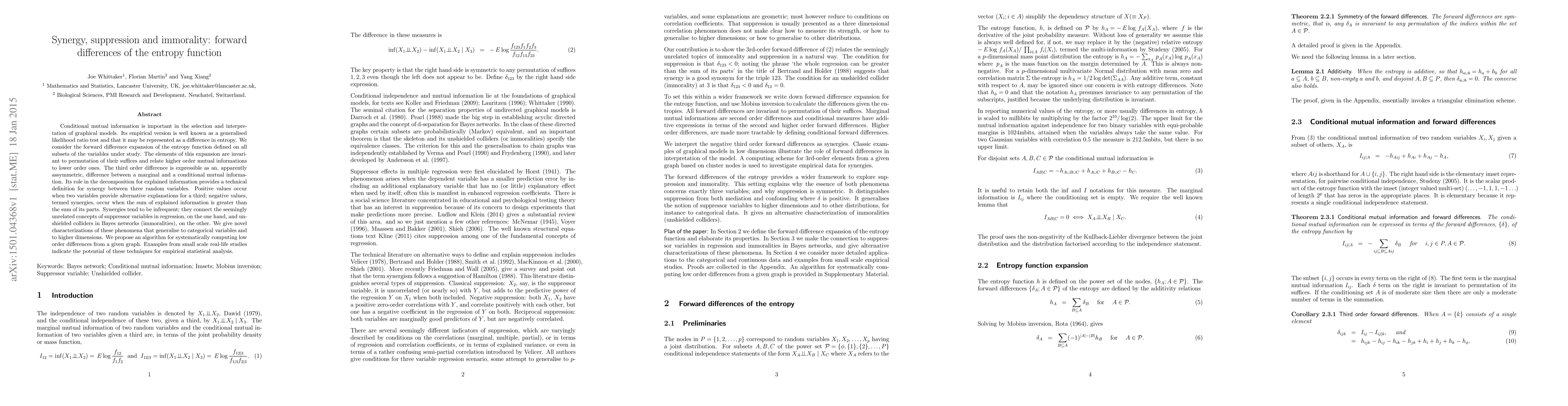 Conditional mutual information is important in the selection and interpretation of graphical models. Its empirical version is well known as a generalised likelihood ratio test and that it may be represented as a difference in entropy. We consider the forward difference expansion of the entropy function defined on all subsets of the variables under study. The elements of this expansion are invariant to permutation of their suffices and relate higher order mutual informations to lower order ones. The third order difference is expressible as an, apparently assymmetric, difference between a marginal and a conditional mutual information. Its role in the decomposition for explained information provides a technical definition for synergy between three random variables. Positive values occur when two variables provide alternative explanations for a third; negative values, termed synergies, occur when the sum of explained information is greater than the sum of its parts. Synergies tend to be infrequent; they connect the seemingly unrelated concepts of suppressor variables in regression, on the one hand, and unshielded colliders in Bayes networks (immoralities), on the other. We give novel characterizations of these phenomena that generalise to categorical variables and to higher dimensions. We propose an algorithm for systematically computing low order differences from a given graph. Examples from small scale real-life studies indicate the potential of these techniques for empirical statistical analysis.
