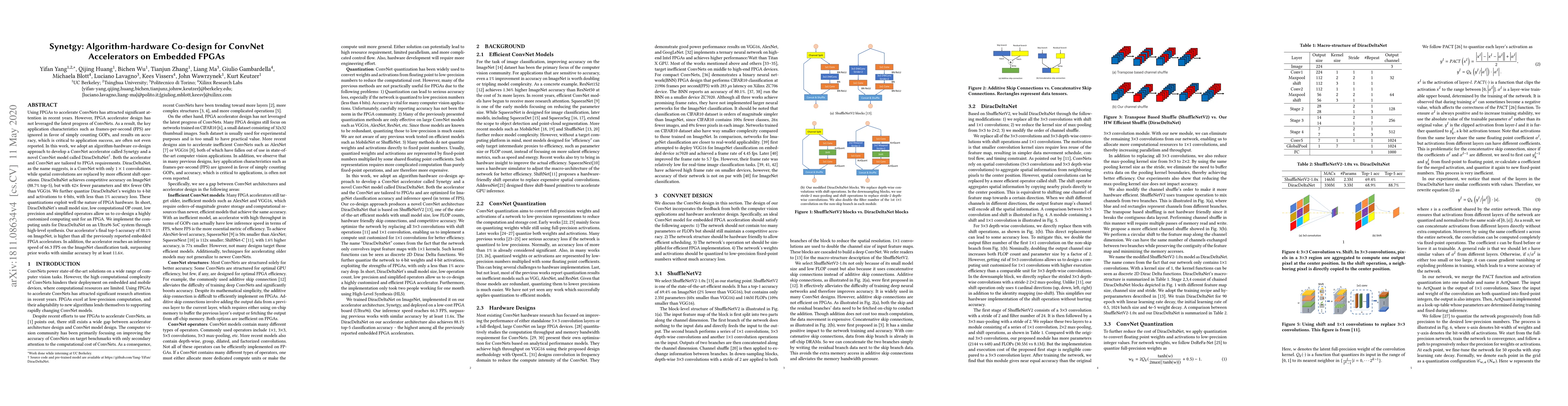 This paper presents Synetgy, an algorithm-hardware co-design approach for ConvNet accelerators on embedded FPGAs, featuring a novel ConvNet model called DiracDeltaNet$^{\dagger}$. DiracDeltaNet achieves high accuracy with minimal parameters and operations, enabling a highly customized FPGA accelerator that achieves superior inference speed and accuracy compared to previous works.