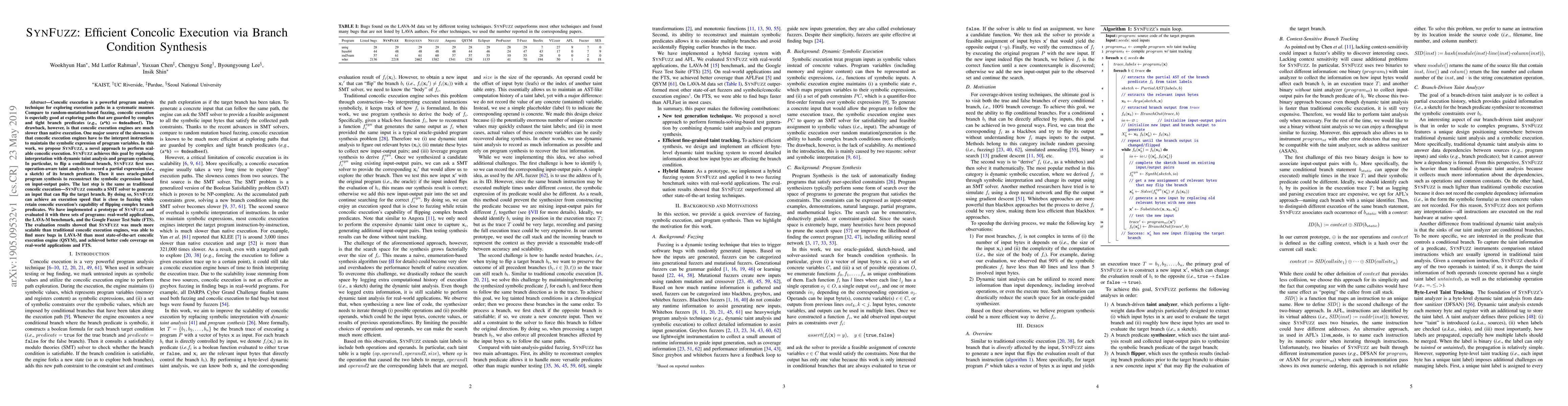 SynFuzz proposes an efficient concolic execution method by replacing interpretation with dynamic taint analysis and program synthesis, achieving near-fuzzing speed while maintaining the ability to explore complex branch predicates. Evaluations show SynFuzz outperforms traditional concolic execution in scalability and bug detection.