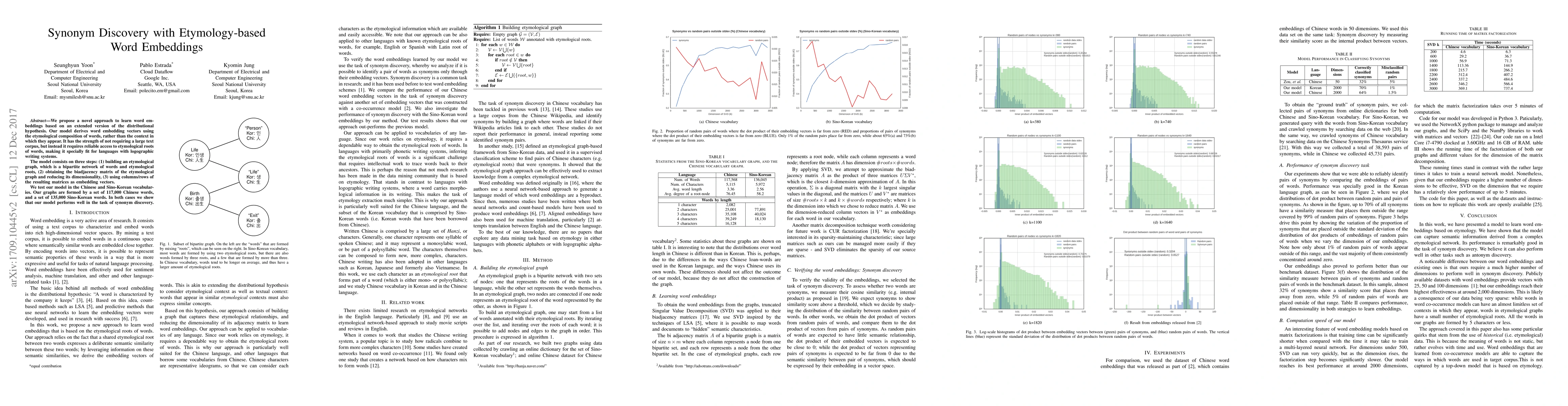 This paper proposes a method to create word embeddings using etymological roots instead of context, which is particularly useful for logographic languages like Chinese and Sino-Korean. The model shows effective synonym discovery without needing large text corpora, relying instead on etymological graphs.