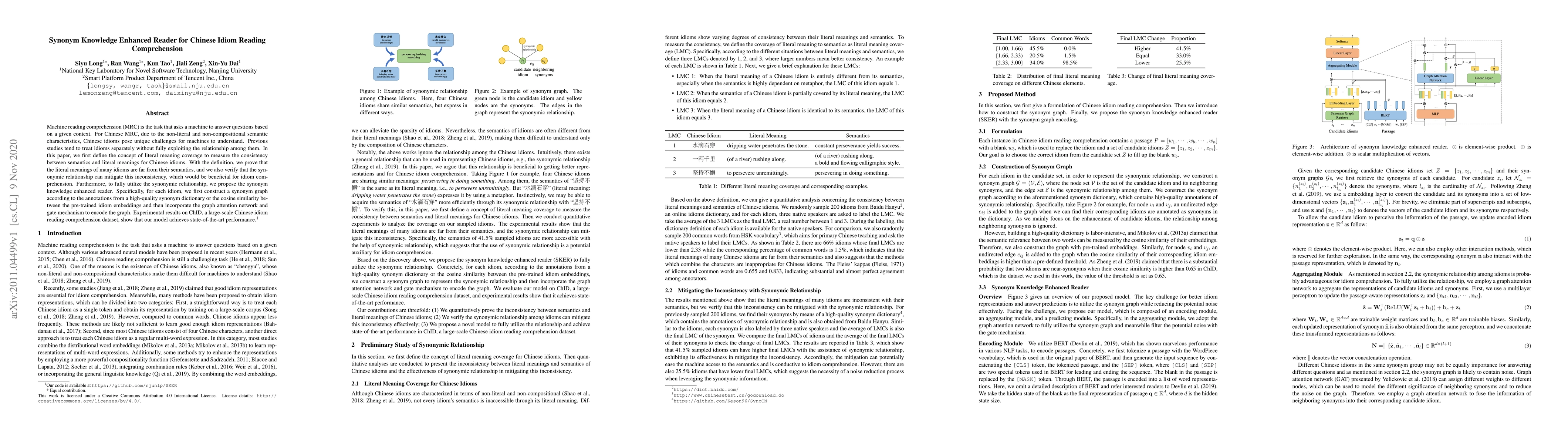 The paper proposes a Synonym Knowledge Enhanced Reader (SKER) for Chinese idiom reading comprehension, utilizing synonym graphs constructed from high-quality dictionaries or pre-trained embeddings, and incorporating graph attention networks and gate mechanisms.