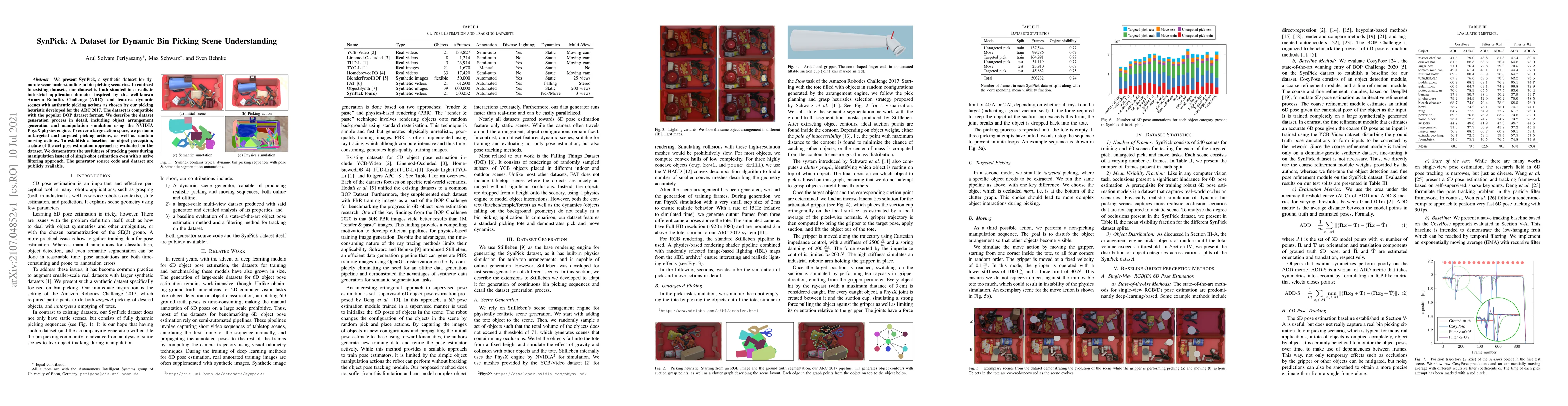 SynPick is a synthetic dataset for dynamic bin-picking scenarios inspired by the Amazon Robotics Challenge, featuring realistic industrial scenes and dynamic picking actions. It includes untargeted and targeted picking actions and is compatible with the BOP dataset format, with source code and dataset publicly available.