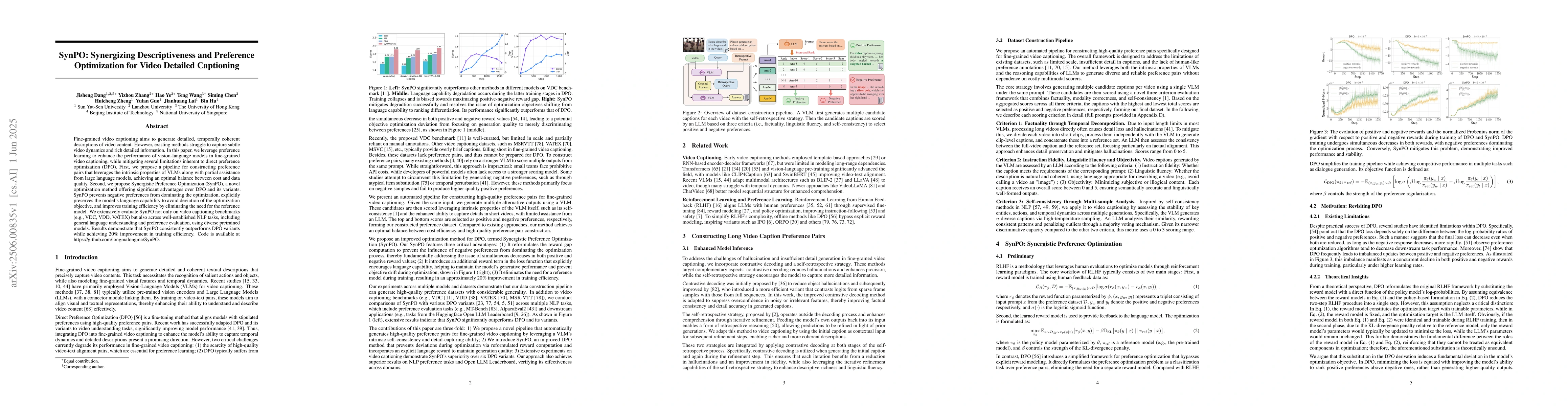 SynPO introduces a novel approach to video captioning by synergizing descriptive capabilities with preference optimization, addressing DPO's limitations through a unique preference pair construction method and optimization technique.