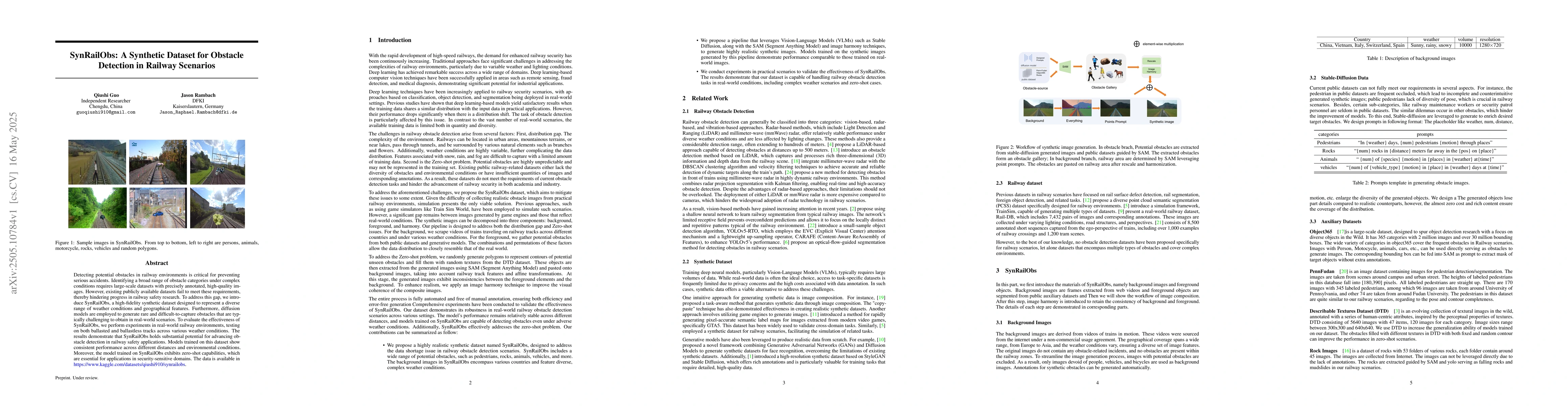 The research introduces SynRailObs, a synthetic dataset for obstacle detection in railway scenarios, generated using diffusion models to represent diverse weather conditions and geographical features, including rare and challenging-to-capture obstacles.